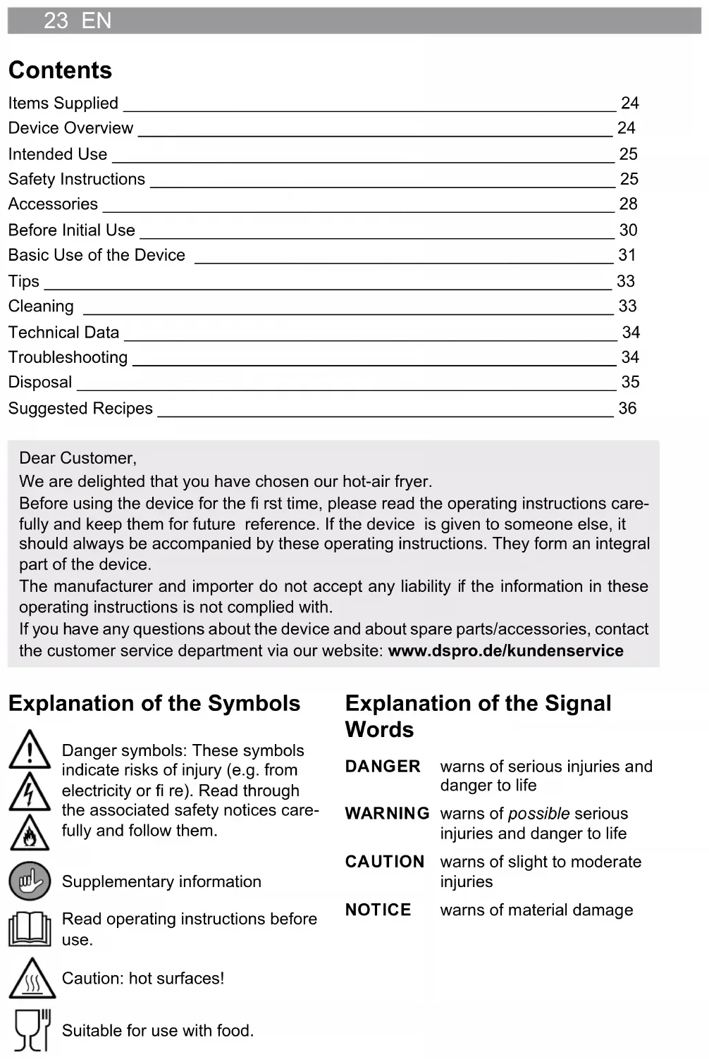 verlängern. Alle Rechte vorbehalten.DE 2223 EN Contents Items Supplied _____________________________________________________ 24 Device Overview ___________________________________________________ 24 Intended Use ______________________________________________________ 25 Safety Instructions __________________________________________________ 25 Accessories _______________________________________________________ 28 Before Initial Use ___________________________________________________ 30 Basic Use of the Device _____________________________________________ 31 Tips _____________________________________________________________ 33 Cleaning _________________________________________________________ 33 Technical Data _____________________________________________________ 34 Troubleshooting ____________________________________________________ 34 Disposal __________________________________________________________ 35 Suggested Recipes _________________________________________________ 36 Dear Customer, We are delighted that you have chosen our hot-air fryer. Before using the device for the fi rst time, please read the operating instructions care- fully and keep them for future reference. If the device is given to someone else, it should always be accompanied by these operating instructions. They form an integral part of the device. The manufacturer and importer do not accept any liability if the information in these operating instructions is not complied with. If you have any questions about the device and about spare parts/accessories, contact the customer service department via our website: www.dspro.de/kundenservice Explanation of the Symbols Danger symbols: These symbols indicate risks of injury (e.g. from electricity or fi re). Read through the associated safety notices care- fully and follow them. Supplementary information Read operating instructions before use. Caution: hot surfaces! Suitable for use with food. Explanation of the Signal Words DANGER warns of serious injuries and danger to life WARNING warns of possible serious injuries and danger to life CAUTION warns of slight to moderate injuries NOTICE warns of material damageEN 24 Items Supplied (See front fold-out page for illustrations) 1 Main unit (1 x) 2 Rotating basket (1 x) 3 Rotating spit fork with locking screw (2 x) 4 Shaft (of the rotating spit or rack for skewers) (1 x) 5 Removal tool (1 x) 6 Rack wheel with locking screw (for skewers) (2 x) 7 Skewer (10 x) 8 Fat collecting tray / baking tray (1 x) 9 Baking rack (3 x) Operating instructions (1 x) Device Overview (See front fold-out page for illustrations) Main Unit 10 On / Off switch 11 Control dial for setting the temperature and time 12 Lighting 13 Support for the shaft and the rotating basket (right) 14 Rails 15 Door 16 Cooking space 17 Holder for the shaft and the rotating basket (left) 18 Heating element 19 Control panel 20 Air outlet openings 21 Air inlet slots Control Panel 22 Display (alternating display of temperature and remaining cooking time during oper- ation) 23 Operating lamps (lighting up successively: device is in operation; fl ashing: operation has been interrupted) 24 8 programs 25 Switch the light in the device on/off 26 Switch rotating function (rotating basket, rotating spit, rack for skewers) on/off 27 Temperature control – hold down to switch between the °C and °F units; press briefl y and the temperature can be set with the control dial 28 Set the cooking time: press briefl y, then set the cooking time with the control dial25 EN Intended Use