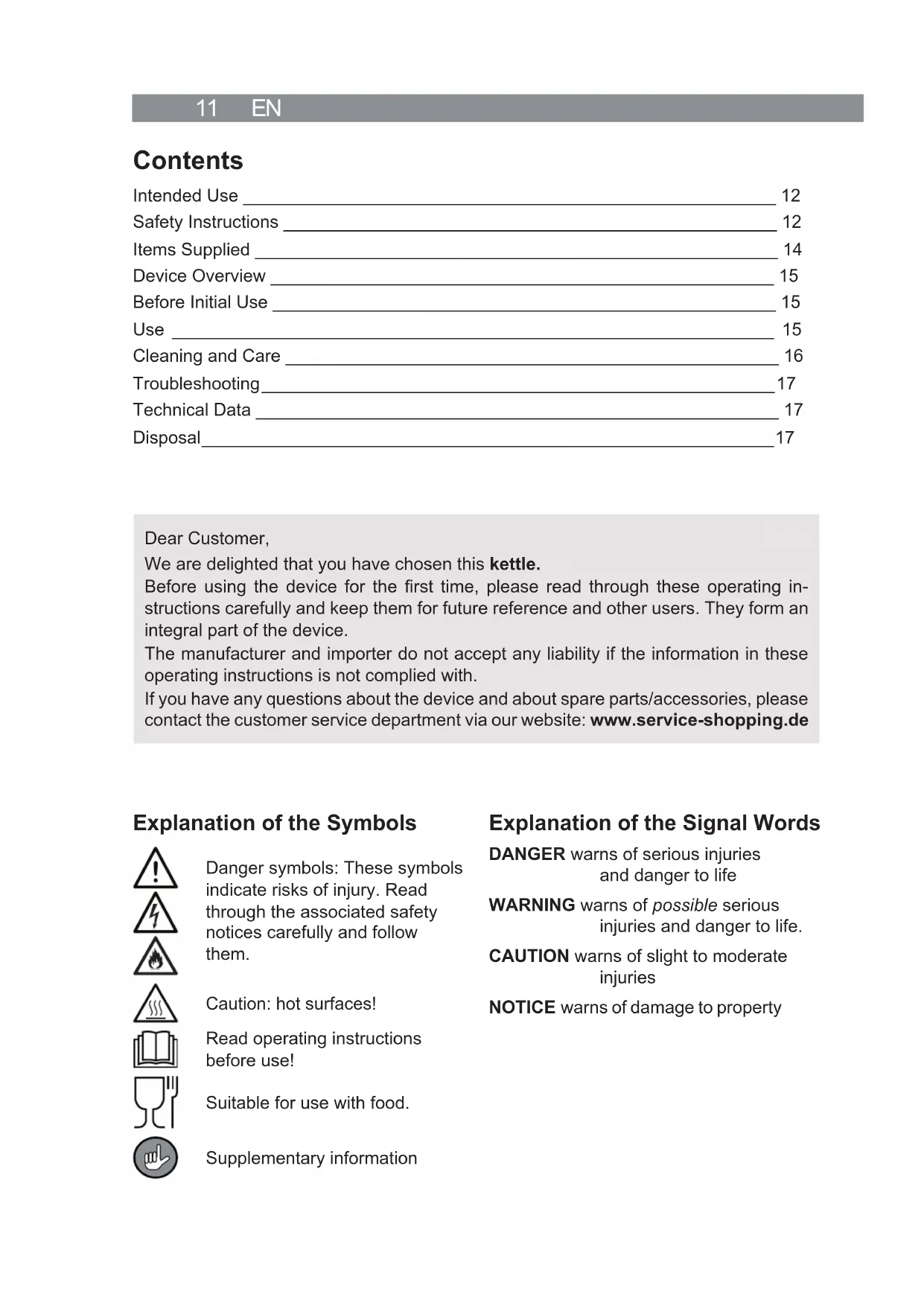 tions and technical data provided with this device. Fail- ure to follow the safety notices and instructions may result in electric shock, fi re and / or injuries. ■ This device may be used by children aged 8 and over and by people with reduced physical, sensory or mental abilities or a lack of experience and / or knowledge if they are supervised or have received instruction on how to use the device safely and have understood the dangers resulting from failure to comply with the relevant safety precautions. ■ Children must not play with the device. ■ Cleaning and user maintenance may not be performed by chil- dren, unless they are older than 8 years of age and are super- vised. ■ Children younger than 8 years of age and animals must be kept away from the device and the mains connecting cable. CAUTION: hot surfaces! The kettle will become very hot during use. Do not come into contact with heated parts while or after using the kettle! Only ever touch the handle when the kettle is in operation or contains hot water. ■ The base station must always be disconnected from the mains power when left unattended and before cleaning it. ■ Never immerse the kettle, base station or the mains connecting cable in water or other liquids and ensure that they cannot fall into water.13 EN ■ Use the kettle only with the base station provided. Do not use the base station with other devices. ■ Never exceed the maximum fi ll level (note the MAX marking on the water level indicator!). If the kettle is overfi lled, boiling water could escape from the pouring spout. ■ Do not make any modifi cations to the device. Also do not re- place the mains cable yourself. If the kettle, the base station or the mains connecting cable are damaged, they must be re- placed by the manufacturer, customer service department or a specialist workshop in order to avoid any hazards. ■ The device is not designed to be operated with an external timer or a separate remote control system. ■ Note the cleaning instructions in the “Cleaning and Care” chapter! DANGER – Risk of Electric Shock ■ Use and store the device only in closed rooms. Do not operate the device in rooms with high humidity. ■ Should the base station fall into water, switch off the power supply immediately. Do not attempt to pull it out of the water while it is still connected to the mains power! Have the base station and the kettle checked in a specialist workshop before using it again. ■ Never touch the base station and the mains connecting cable with wet hands when these components are connected to the mains power. ■ Take the kettle off the base station to fi ll it, pour water or clean it. Make sure that no water gets into the contacts on the bottom of the kettle. WARNING – Danger of Fire ■ Do not use the device in rooms containing easily ignitable or explosive substances. ■ Do not operate the device in the vicinity of combustible material. Do not place any combustible materials (e. g. cardboard, paper or plastic) on or in the device. ■ Do not connect the device along with other consumers (with a high wattage) to a mul- tiple socket in order to prevent overloading and a possible short circuit (fi re). ■ Do not cover the device during operation in order to prevent it from catching fi re. ■ In the event of a fi re: Do not extinguish with water! Smother the fl ames with a fi re blanket or a suitable fi re extinguisher. WARNING – Danger of Injury ■ Danger of suffocation! Keep children and animals away from the packaging material. ■ Danger of strangulation! Make sure that the mains cable is always kept out of the reach of small children and animals.EN 14 ■ Danger of scalding! – Avoid coming into contact with the steam rising up from the pouring spout. Do not open the lid during the boiling process. Allow the device to cool down before fi lling it again! – Pour out boiling water slowly and carefully without tipping the device too quickly. – Do not move the device during the boiling process. – The mains cable must not hang down from the surface on which the device is placed in order to prevent the device from being pulled down. ■ Danger of tripping! Make sure that the connected mains cable does not present a trip hazard. NOTICE – Risk of Damage to Material and Property ■ The base station should only be connected to a properly installed plug socket with safety contacts. The socket must be readily accessible so that the connection to the mains can quickly be isolated. The mains voltage must be the same as that stated in the technical data for the base station. ■ Only use suitable extension cables whose technical data is the same as that of the base station. ■ Remove the mains plug if a fault occurs during operation or before a thunderstorm. ■ Protect the device from other heat sources, naked fl ames, sub-zero temperatures, direct sunlight, persistent moisture and collisions. ■ Do not operate the device without water or with less water than is required to reach the MIN marking. If this does happen, the device switches off automatically. In this case, allow the device to cool down before cold water is poured in and the device is switched on. ■ Allow the kettle to cool down before it is fi lled with cold water to prevent glass break- age. ■ Make sure that the mains cable is not squashed, bent or laid over sharp edges and does not come into contact with hot surfaces (e. g. of the device). ■ When the mains plug is removed from the plug socket, always pull on the mains plug and never the mains cable. Do not pull or carry the base station by the mains cable. ■ Never place heavy objects on the base station or the mains cable. ■ Use only original spare parts from the manufacturer. If accessory parts which are not authorised by the manufacturer are used, all warranty and guarantee claims are void. Items Supplied 1 x kettle 1 x base station with mains connecting cable 1 x operating instructions Check the ite