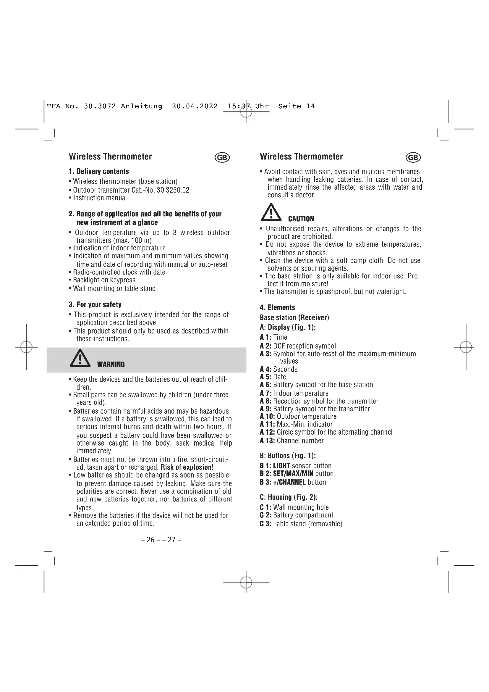 - During night-time, the atmospheric interference is usu- ally less severe. A single daily reception is adequate to keep the accuracy deviation under 1 second. In extreme cases, please place the unit close to a window to improve reception. TFA_No. 30.3072_Anleitung 20.04.2022 15:37 Uhr Seite 15– 30 – – 31 – Wireless Thermometer