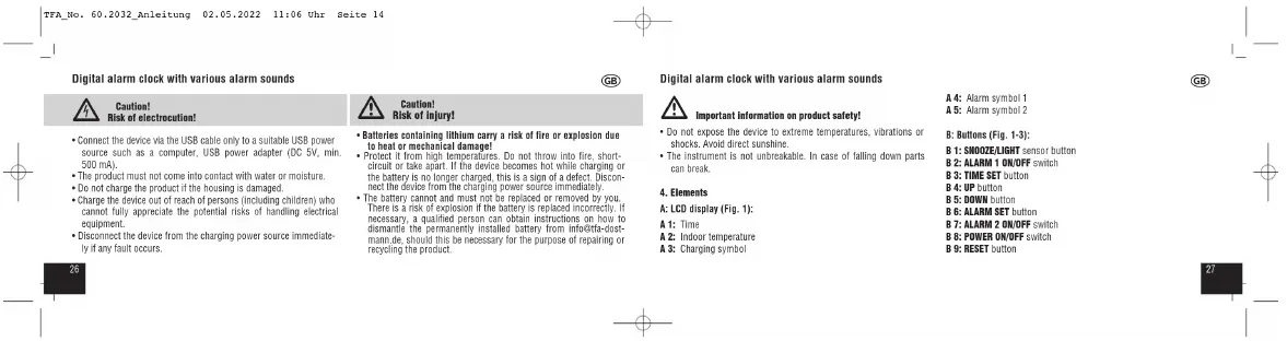 - The battery cannot and must not be replaced or removed by you. There is a risk of explosion if the battery is replaced incorrectly. If necessary, a qualified person can obtain instructions on how to dismantle the permanently installed battery from info@tfa-dost- mann.de, should this be necessary for the purpose of repairing or recycling the product. Digital alarm clock with various alarm sounds