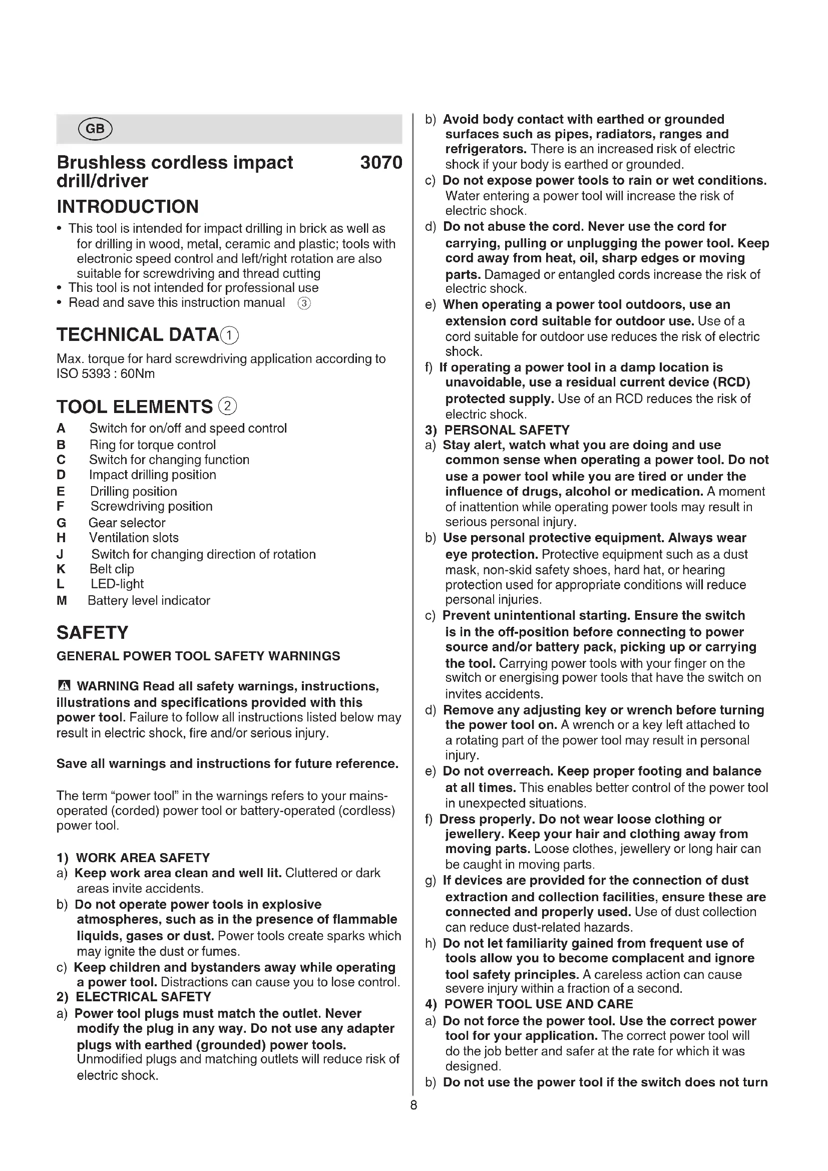 a) Recharge only with the charger specied by the manufacturer. A charger that is suitable for one type of battery pack may create a risk of re when used with another battery pack. b) Use power tools only with specically designated battery packs. Use of any other battery packs may create a risk of injury and re. c) When battery pack is not in use, keep it away from other metal objects like paper clips, coins, keys, nails, screws, or other small metal objects that can make a connection from one terminal to another. Shorting the battery terminals together may cause burns or a re. d) Under abusive conditions, liquid may be ejected from the battery; avoid contact. If contact accidentally occurs, ush with water. If liquid contacts eyes, additionally seek medical help. Liquid ejected from the battery may cause irritation or burns. e) Do not use a battery pack or tool that is damaged or modied. Damaged or modied batteries may exhibit unpredictable behaviour resulting in re, explosion or risk of injury. f) Do not expose a battery pack or tool to re or excessive temperature. Exposure to re or temperature above 130°C may cause explosion. g) Follow all charging instructions and do not charge the battery pack or tool outside the temperature range specied in the instructions. Charging improperly or at temperatures outside the specied range may damage the battery and increase the risk of re.10 - when turning in a screw, rst try VariTorque position 1 and increase until the desired depth has been reached - position E will lock up the clutch to permit (non-impact) drilling or driving heavy-duty work - position D will lock up the clutch to permit impact drilling only ! ensure that gear selector G is in position 2 when function selector C is in impact drilling position ! do not use impact drilling position D for drilling in wood, metal, ceramic and plastic to prevent the drill/screw bit from being damaged