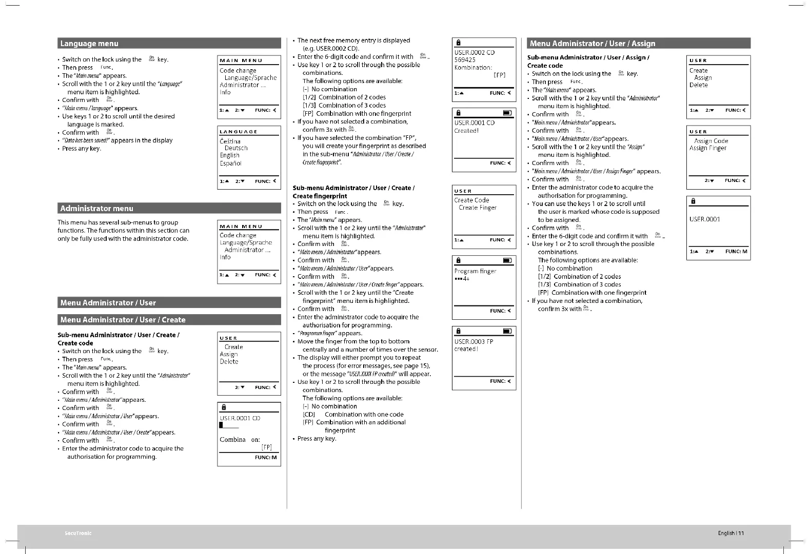 • Change code• Language• Administrator > User > Create > Create code > Create ngerprint > Assign > Assign code > Assign ngerprint > Delete > Time functions > Set time > Set date > Automatic ST/WT > Delay time > Programming > Database update > Firmware update > Reorganise > Processes > Display > Save > Setup > Register > FP reset > Generate AES key • Info > System info > System check Description of the menu functions Code Change menu Change the administrator code and the user codes.We would like to point out that, for security reasons, the factory-set administrator code must be changed to an individually set code.• Switch on the lock using the