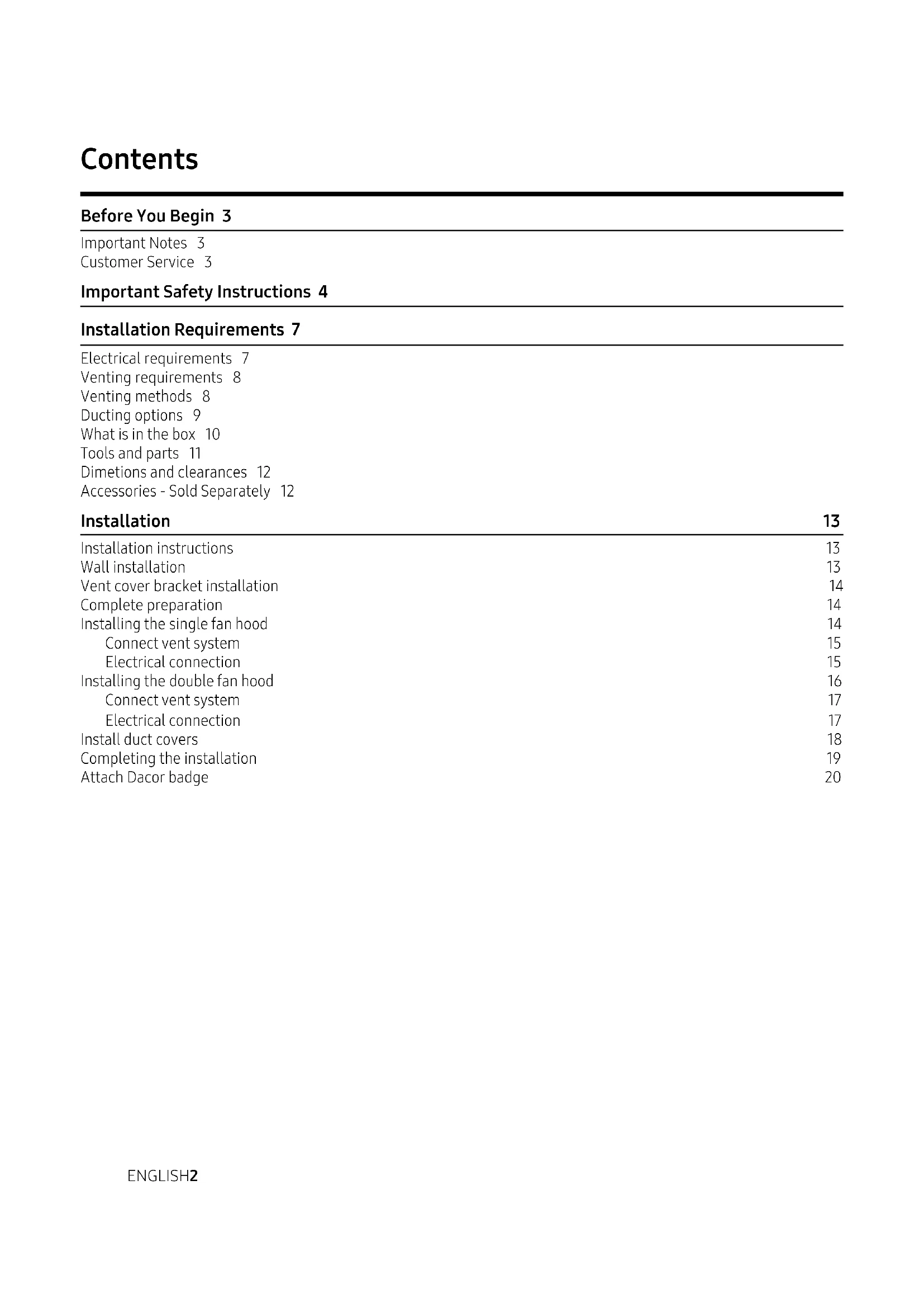 Contents Before You Begin 3 Important Notes 3 Customer Service 3 Important Safety Instructions 4 Installation Requirements 7 Electrical requirements 7 Venting requirements 8 Venting methods 8 Ducting options 9 What is in the box 10 Tools and parts 11 Dimetions and clearances 12 Accessories - Sold Separately 12 Installation 13 Installation instructions 13 Wall installation 13 Vent cover bracket installation 14 Complete preparation 14 Installing the single fan hood 14 Connect vent system 15 Electrical connection 15 Installing the double fan hood 16 Connect vent system 17 Electrical connection 17 Install duct covers 18 Completing the installation 19 Attach Dacor badge 20ENGLISH 3 Important Notes Installer