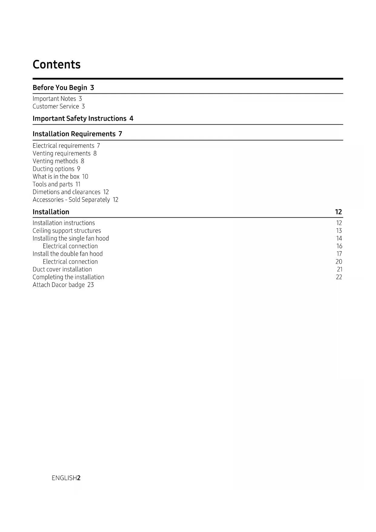 Contents Before You Begin 3 Important Notes 3 Customer Service 3 Important Safety Instructions 4 Installation Requirements 7 Electrical requirements 7 Venting requirements 8 Venting methods 8 Ducting options 9 What is in the box 10 Tools and parts 11 Dimetions and clearances 12 Accessories - Sold Separately 12 Installation 12 Installation instructions 12 Ceiling support structures 13 Installing the single fan hood 14 Electrical connection 16 Install the double fan hood 17 Electrical connection 20 Duct cover installation 21 Completing the installation 22 Attach Dacor badge 23ENGLISH 3 Important Notes Installer