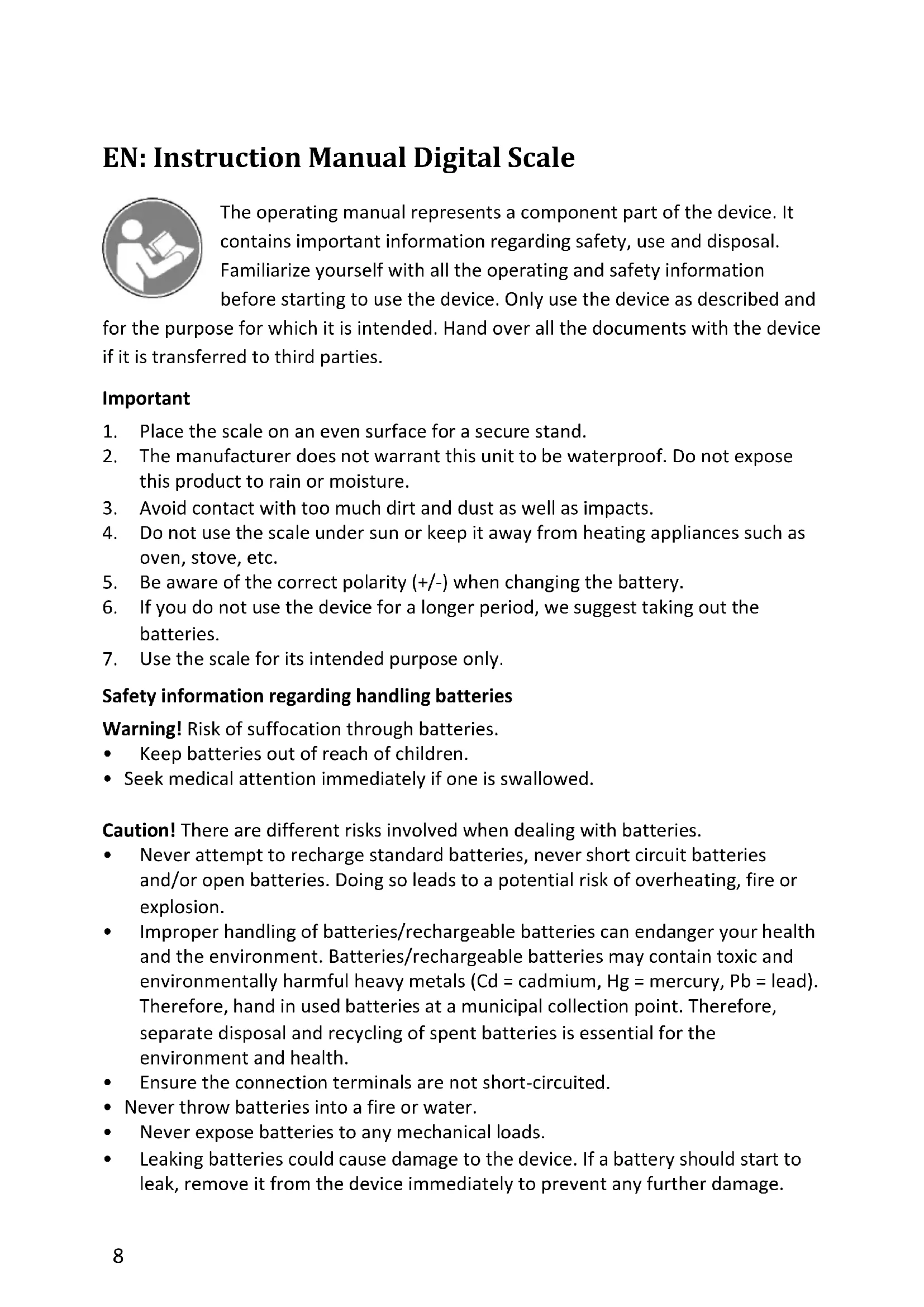 - Improper handling of batteries/rechargeable batteries can endanger your health and the environment. Batteries/rechargeable batteries may contain toxic and environmentally harmful heavy metals (Cd = cadmium, Hg = mercury, Pb = lead). Therefore, hand in used batteries at a municipal collection point. Therefore, separate disposal and recycling of spent batteries is essential for the environment and health.