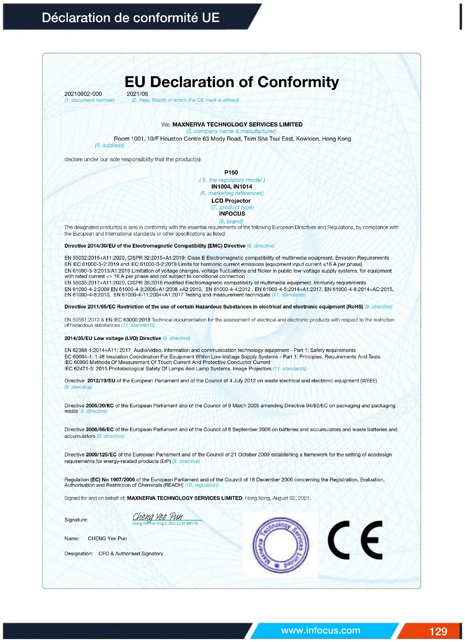 Déclaration de conformité UE EU Declaration of Conformity We, MAXNERVA TECHNOLOGY SERVICES LIMITED(3. company name & manufacturer) Room 1001, 10/F Houston Centre 63 Mody Road, Tsim Sha Tsui East, Kowloon, Hong Kong (4. address) declare under our sole responsibility that the product(s): P160 ( 5. the regulatory model )IN1004, IN1014(6. marketing references) LCD Projector(7. product type)INFOCUS(8. brand) The designated product(s) is (are) in conformity with the essential requirements of the following European Directives and Regulations, by compliance with the European and International standards or other specifications as listed:Directive 2014/30/EU of the Electromagnetic Compatibility (EMC) Directive (9. directive) EN 55032:2015+A11:2020, CISPR 32:2015+A1:2019: Class B Electromagnetic compatibility of multimedia equipment. Emission Requirements EN IEC 61000-3-2:2019 and IEC 61000-3-2:2018 Limits for harmonic current emissions (equipment input current ≤16 A per phase) EN 61000-3-3:2013/A1:2019 Limitation of voltage changes, voltage fluctuations and flicker in public low-voltage supply systems, for equipment with rated current <= 16 A per phase and not subject to conditional connection EN 55035:2017+A11:2020, CISPR 35:2016 modified Electromagnetic compatibility of multimedia equipment. Immunity requirements EN 61000-4-2:2009 EN 61000-4-3:2006+A1:2008 +A2:2010, EN 61000-4-4:2012 , EN 61000-4-5:2014+A1:2017, EN 61000-4-6:2014+AC:2015, EN 61000-4-8:2010, EN 61000-4-11:2004+A1:2017 Testing and measurement techniques (11. standards) Directive 2011/65/EC Restriction of the use of certain Hazardous Substances in electrical and electronic equipment (RoHS) (9. directive) EN 50581:2012 & EN IEC 63000:2018 Technical documentation for the assessment of electrical and electronic products with respect to the restriction of hazardous substances (11. standards) 2014/35/EU Low voltage (LVD) Directive (9. directive) EN 62368-1:2014+A11: 2017 Audio/video, information and communication technology equipment - Part 1: Safety requirements EC 60664-1: 1.48 Insulation Coordination For Equipment Within Low-Voltage Supply Systems - Part 1: Principles, Requirements And Tests IEC 60990 Methods Of Measurement Of Touch Current And Protective Conductor Current IEC 62471-5: 2015 Photobiological Safety Of Lamps And Lamp Systems. Image Projectors (11. standards) Directive 2012/19/EU of the European Parliament and of the Council of 4 July 2012 on waste electrical and electronic equipment (WEEE) (9. directive) Directive 2005/20/EC of the European Parliament and of the Council of 9 March 2005 amending Directive 94/62/EC on packaging and packaging waste 9. directive) Directive 2006/66/EC of the European Parliament and of the Council of 6 September 2006 on batteries and accumulators and waste batteries and accumulators (9. directive) Directive 2009/125/EC of the European Parliament and of the Council of 21 October 2009 establishing a framework for the setting of ecodesign requirements for energy-related products (ErP) (9. directive) Regulation (EC) No 1907/2006 of the European Parliament and of the Council of 18 December 2006 concerning the Registration, Evaluation, Authorisation and Restriction of Chemicals (REACH) (10. regulation) Signed for and on behalf of: MAXNERVA TECHNOLOGY SERVICES LIMITED, Hong Kong, August 02, 2021. Signature:Name: CHENG Yee PunDesignation: CFO & Authorised Signatory20210802-000 2021/08(1. document number) (2. Year, Month in which the CE mark is axed)Cheng Yee Pun (Aug 2, 2021 11:34 GMT+8) Cheng Yee Punwww.infocus.com Déclaration de conformité UE