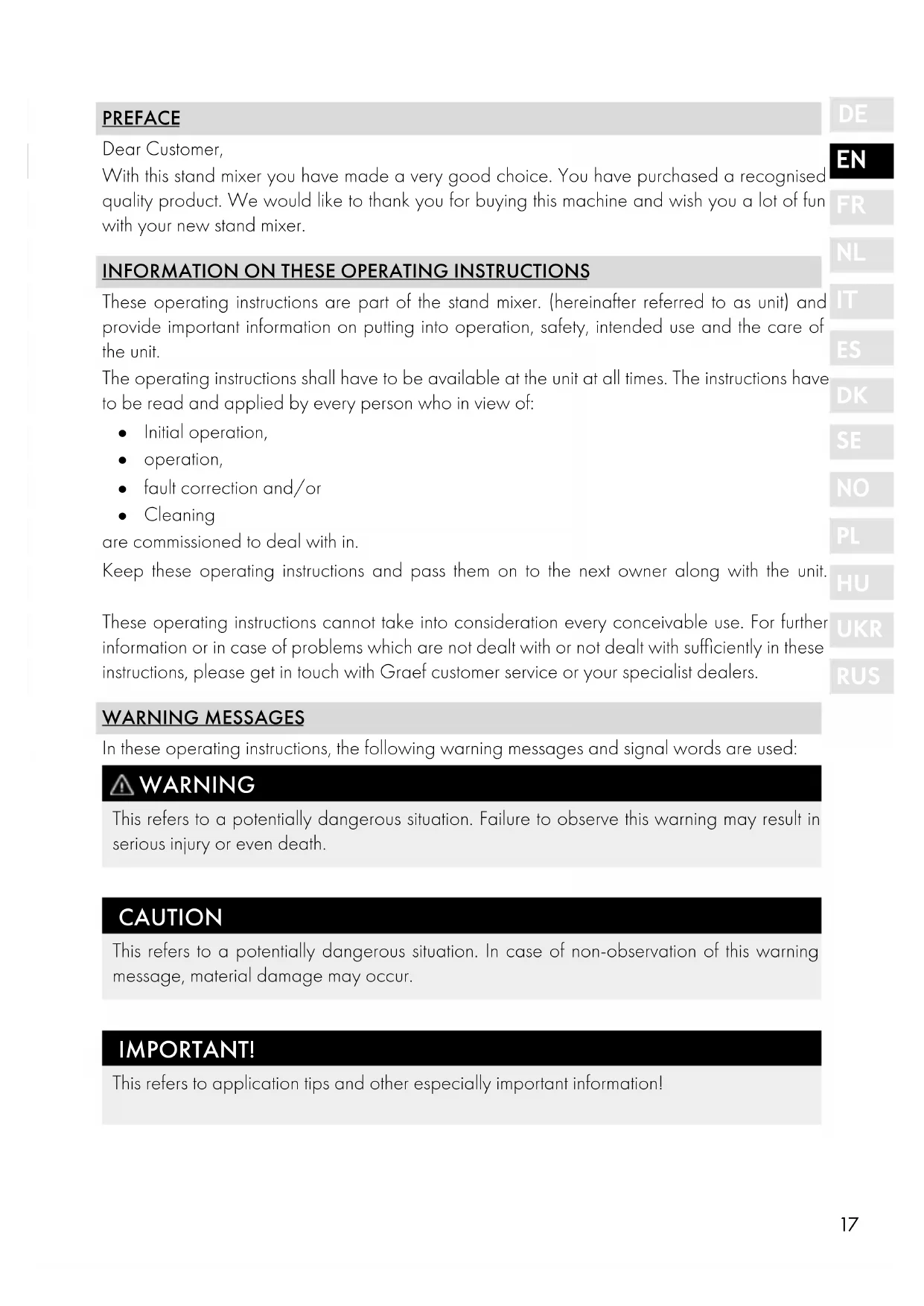 These operating instructions are part of the stand mixer. (hereinafter referred to as unit) and provide important information on putting into operation, safety, intended use and the care of the unit. The operating instructions shall have to be available at the unit at all times. The instructions have to be read and applied by every person who in view of: ● Initial operation, ● operation, ● fault correction and/or ● Cleaning are commissioned to deal with in. Keep these operating instructions and pass them on to the next owner along with the unit. These operating instructions cannot take into consideration every conceivable use. For further information or in case of problems which are not dealt with or not dealt with sufficiently in these instructions, please get in touch with Graef customer service or your specialist dealers. WARNING MESSAGES In these operating instructions, the following warning messages and signal words are used: WARNING This refers to a potentially dangerous situation. Failure to observe this warning may result in serious injury or even death. CAUTION This refers to a potentially dangerous situation. In case of non-observation of this warning message, material damage may occur. IMPORTANT! This refers to application tips and other especially important information! Stirring arm18