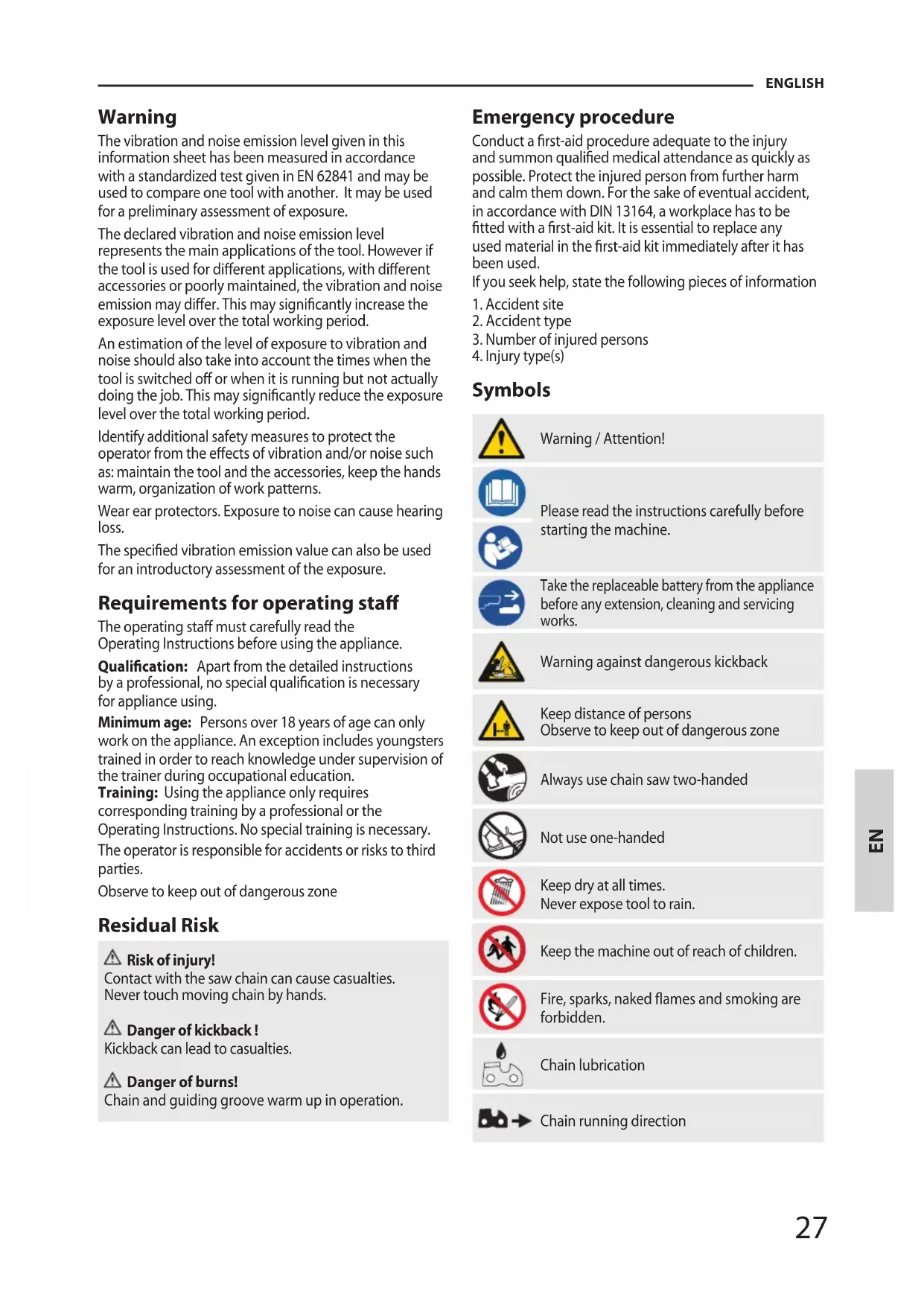 - Protective gloves available from professional chain saw retailers are designed specically for chain saw use which give protection, good grip and also reduce the eect of handle vibration. These gloves should comply with EN 381-7 and must be CE marked. If you experience any of the symptoms of this condition, immediately discontinue use and see your doctor. Warning! Injuries may be caused, or aggravated, by prolonged use of a tool. When using any tool for prolonged periods, ensure you take regular breaks. Specied Conditions of Use The minke chain saw is to be used as a branch saw. The cordless pruning saw is only intended for use outdoors. For safety reasons, the pruning saw must be adequately controlled by using two-handed operation at all times. The pruning saw is designed for cutting branches, trunks, logs, and beams of a diameter determined by the cutting length of the guide bar. It is only designed to cut wood. It is only to be used by adults who have received adequate training on the hazards and preventative measures/ actions to be taken while using the pruning saw. Do not use the pruning saw for any purpose not listed in the specied conditions of use. It is not to be used for professional tree services. The pruning saw is not to be used by children or by persons not wearing adequate personal protective equipment and clothing. Warning! When using the pruning saw, the safety rules must be followed. For your own safety and that of bystanders, you must read and fully understand these instructions before operating the pruning saw. You