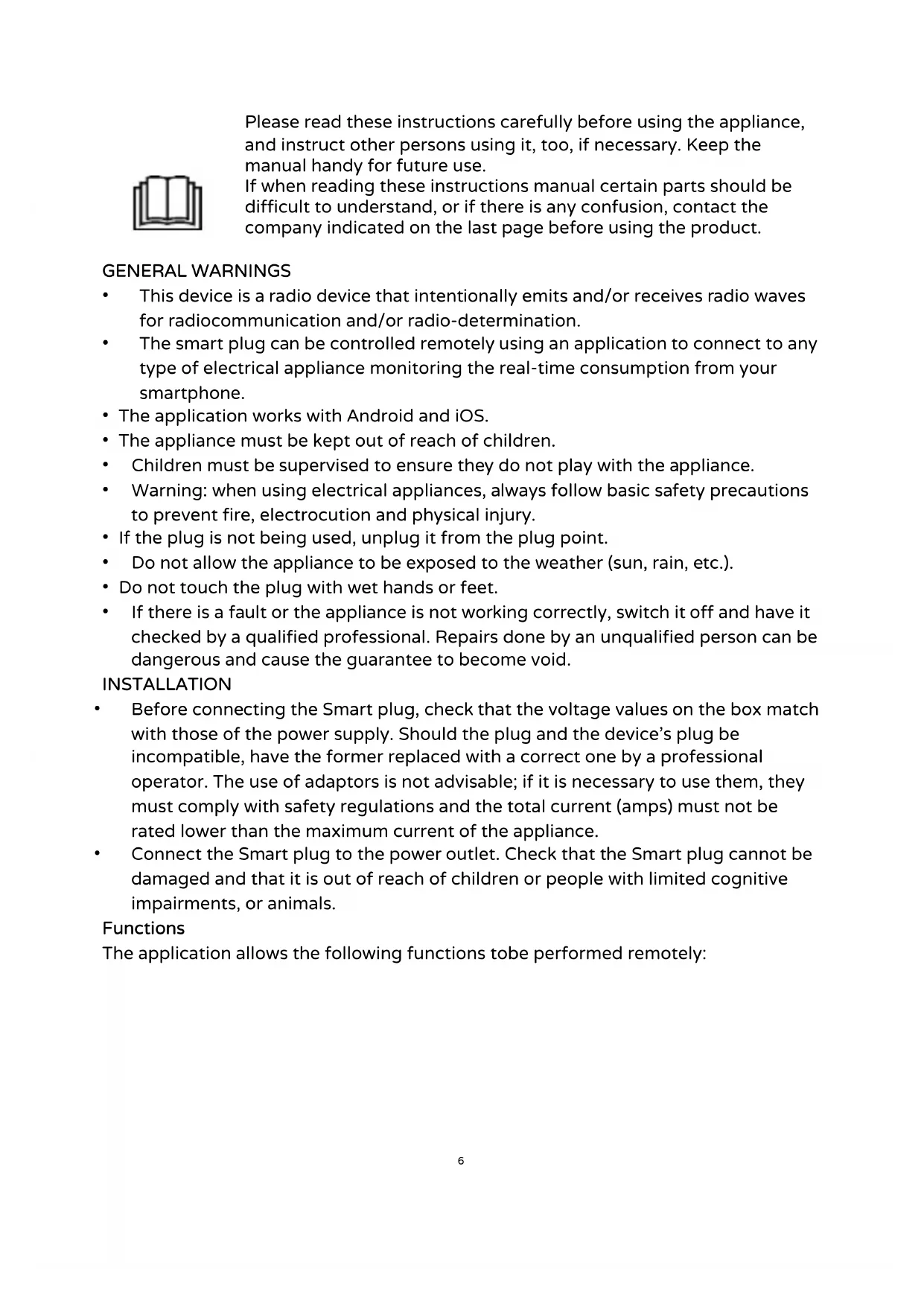 - Before connecting the Smart plug, check that the voltage values on the box match with those of the power supply. Should the plug and the device's plug be incompatible, have the former replaced with a correct one by a professional operator. The use of adaptors is not advisable; if it is necessary to use them, they must comply with safety regulations and the total current (amps) must not be rated lower than the maximum current of the appliance.