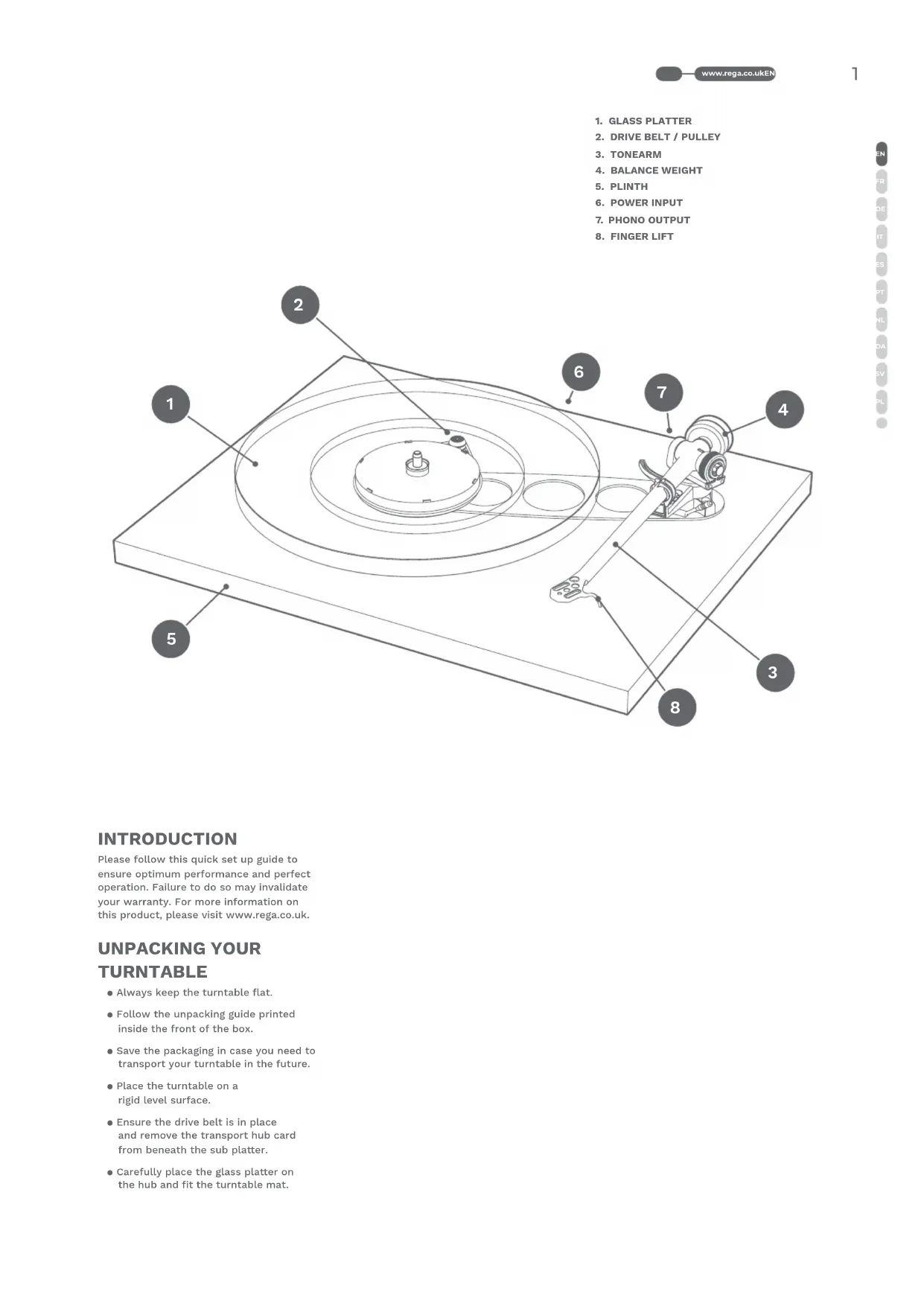 INTRODUCTION Please follow this quick set up guide to ensure optimum performance and perfect operation. Failure to do so may invalidate your warranty. For more information on this product, please visit www.rega.co.uk. UNPACKING YOUR TURNTABLE ● Always keep the turntable flat. ● Follow the unpacking guide printed inside the front of the box. ● Save the packaging in case you need to transport your turntable in the future. ● Place the turntable on a rigid level surface. ● Ensure the drive belt is in place and remove the transport hub card from beneath the sub plaer. ● Carefully place the glass plaer on the hub and fit the turntable mat.