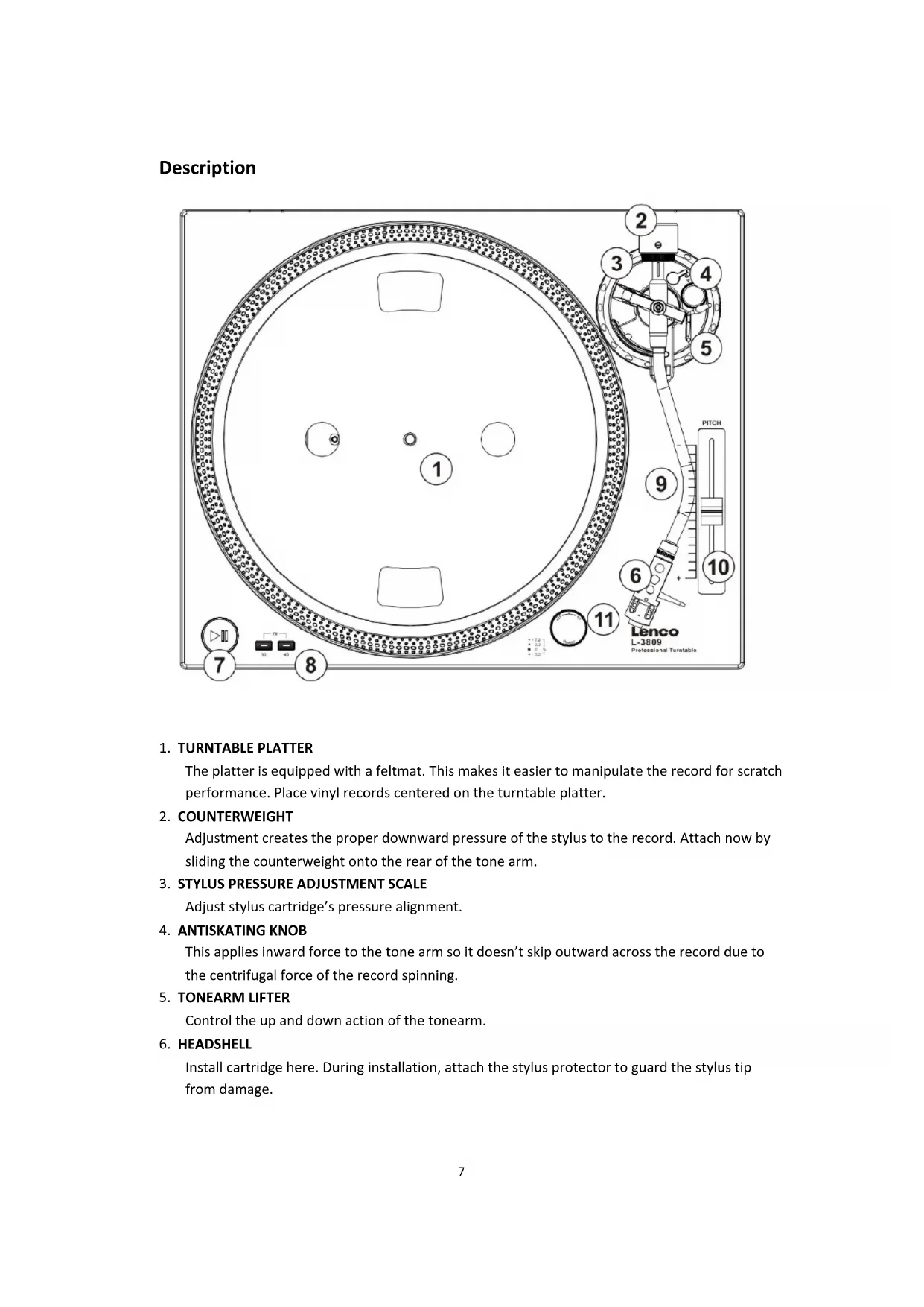 ⚫ Danger of explosion if battery is incorrectly replaced. Replace only with the same or equivalent type. ⚫ Battery cannot be subjected to high or low extreme temperatures, low air pressure at high altitude during use, storage or transportation. ⚫ Replacement of a battery with an incorrect type that can result in an explosion or the leakage of flammable liquid or gas. ⚫ Disposal of a battery into fire or a hot oven, or mechanically crushing or cutting of a battery that can result in an explosion. ⚫ Leaving a battery in an extremely high temperature surrounding environment that can result in an explosion or that leakage of flammable liquid or gas. ⚫ A battery subjected to extremely low air pressure that may result in an explosion or the leakage of flammable liquid or gas. ⚫ Attention should be drawn to the environmental aspects of battery disposal.5 Deliver Content 1 x Manual 1 x RCA audio cable 1 x Power cord6 1 x USB connection cable 1 x Platter 1x Felt mat7 Description
