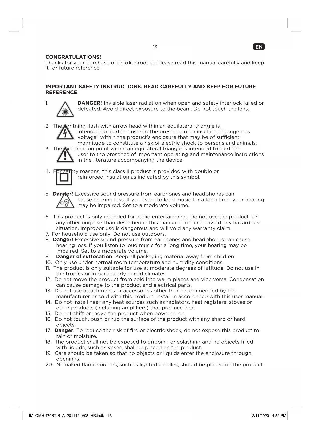 Hereby, [Imtron GmbH] declares that the radio equipment type [OMH 470BT-B] is in compliance with Directive 2014/53/EU. The full text of the EU declaration of conformity is available at the following internet address: http://de.ok-online.com/nc/de/suche.html DISPOSAL Do not dispose of this product as unsorted municipal waste. Return it to a designated collection point for the recycling of WEEE. By doing so, you will help to conserve resources and protect the environment. Contact your retailer or local authorities for more information. Please dispose of batteries in an environmentally friendly manner. Do not put batteries into the household waste. Please use the return and collection systems in your community or contact the dealer where you purchased the product. IM_OMH 470BT-B_A_201112_V03_HR.indb 21IM_OMH 470BT-B_A_201112_V03_HR.indb 21 12/11/2020 4:52 PM12/11/2020 4:52 PM22