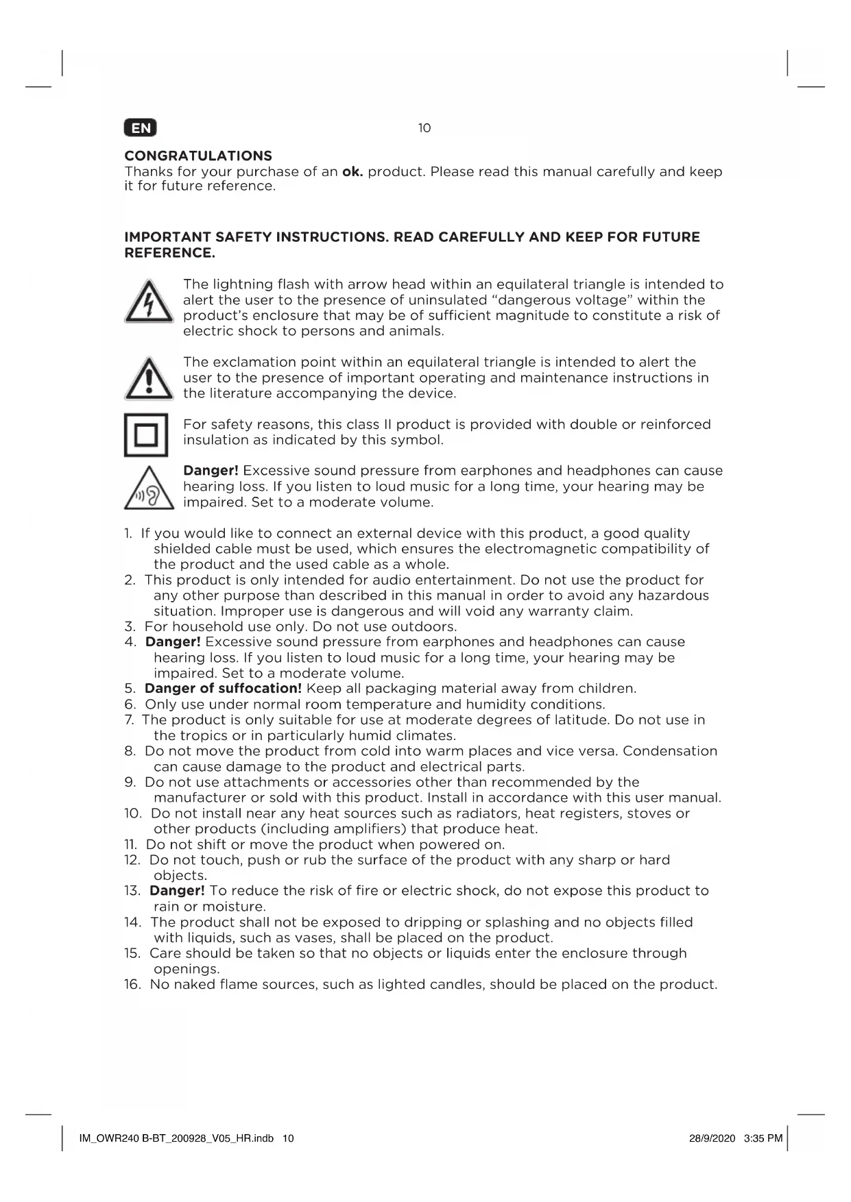CONGRATULATIONS Thanks for your purchase of an ok. product. Please read this manual carefully and keep it for future reference. IMPORTANT SAFETY INSTRUCTIONS. READ CAREFULLY AND KEEP FOR FUTURE REFERENCE. The lightning flash with arrow head within an equilateral triangle is intended to alert the user to the presence of uninsulated “dangerous voltage” within the product’s enclosure that may be of sucient magnitude to constitute a risk of electric shock to persons and animals. The exclamation point within an equilateral triangle is intended to alert the user to the presence of important operating and maintenance instructions in the literature accompanying the device. For safety reasons, this class II product is provided with double or reinforced insulation as indicated by this symbol. Danger! Excessive sound pressure from earphones and headphones can cause hearing loss. If you listen to loud music for a long time, your hearing may be impaired. Set to a moderate volume.
