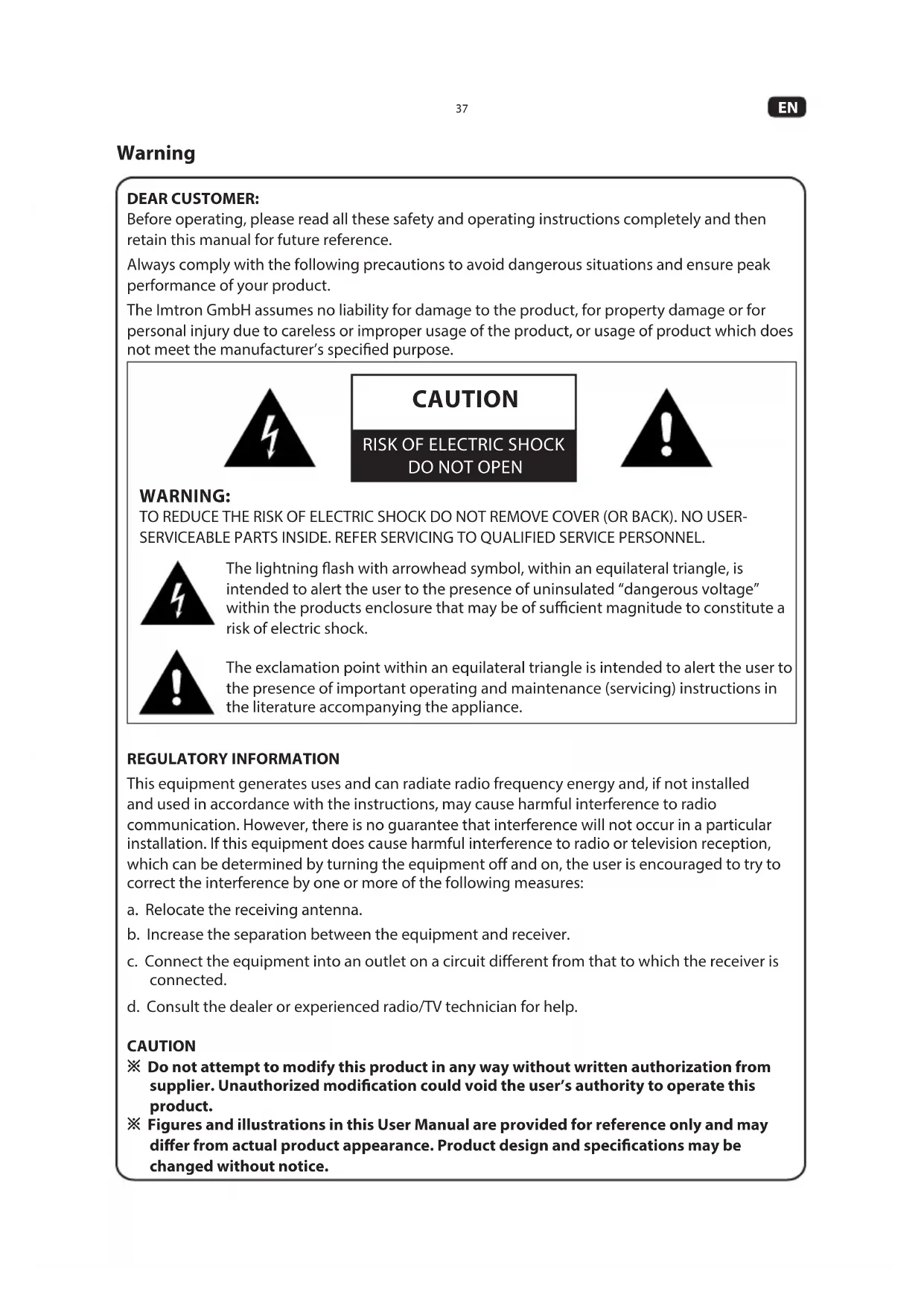 DEAR CUSTOMER: Before operating, please read all these safety and operating instructions completely and then retain this manual for future reference. Always comply with the following precautions to avoid dangerous situations and ensure peak performance of your product. The Imtron GmbH assumes no liability for damage to the product, for property damage or for personal injury due to careless or improper usage of the product, or usage of product which does not meet the manufacturer’s specied purpose. Warning