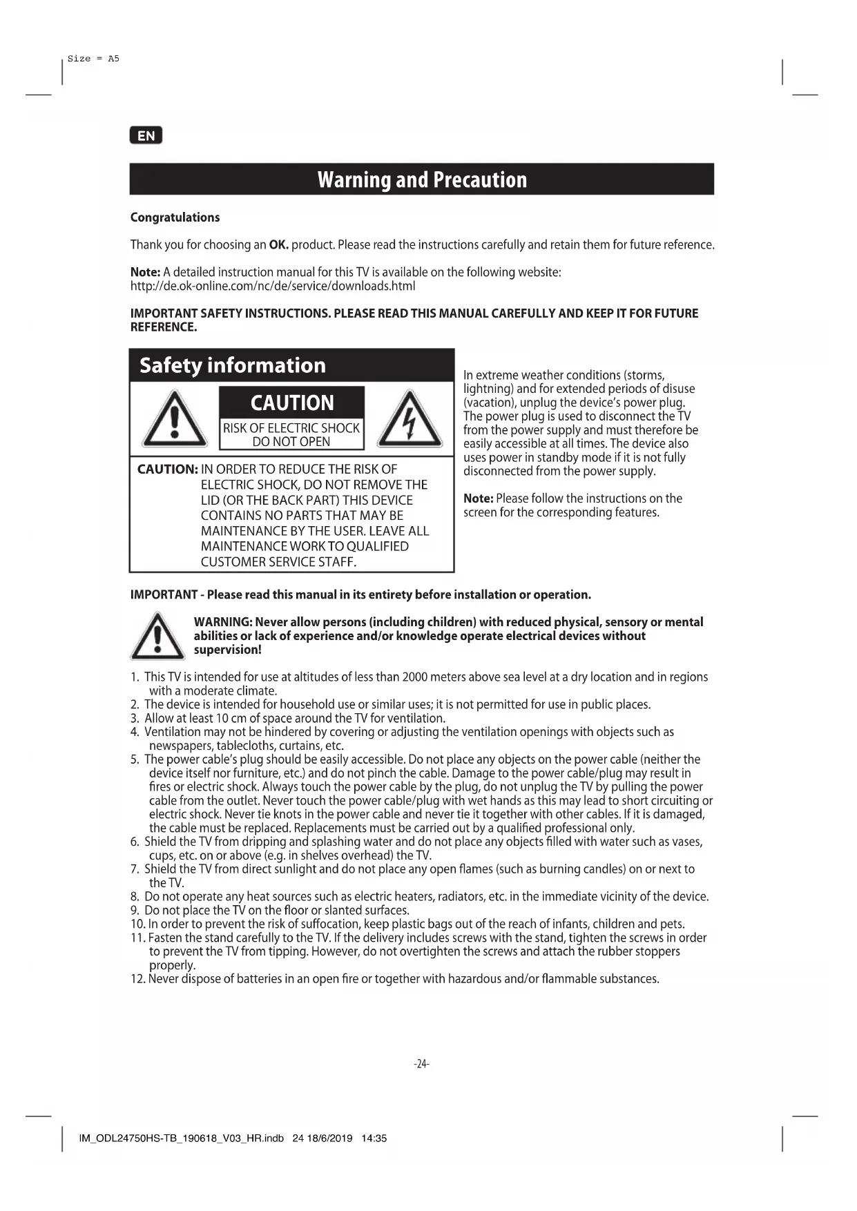 Warning and Precaution Congratulations Thank you for choosing an OK. product. Please read the instructions carefully and retain them for future reference. Note: A detailed instruction manual for this TV is available on the following website: http://de.ok-online.com/nc/de/service/downloads.html IMPORTANT SAFETY INSTRUCTIONS. PLEASE READ THIS MANUAL CAREFULLY AND KEEP IT FOR FUTURE REFERENCE. Safety information CAUTION