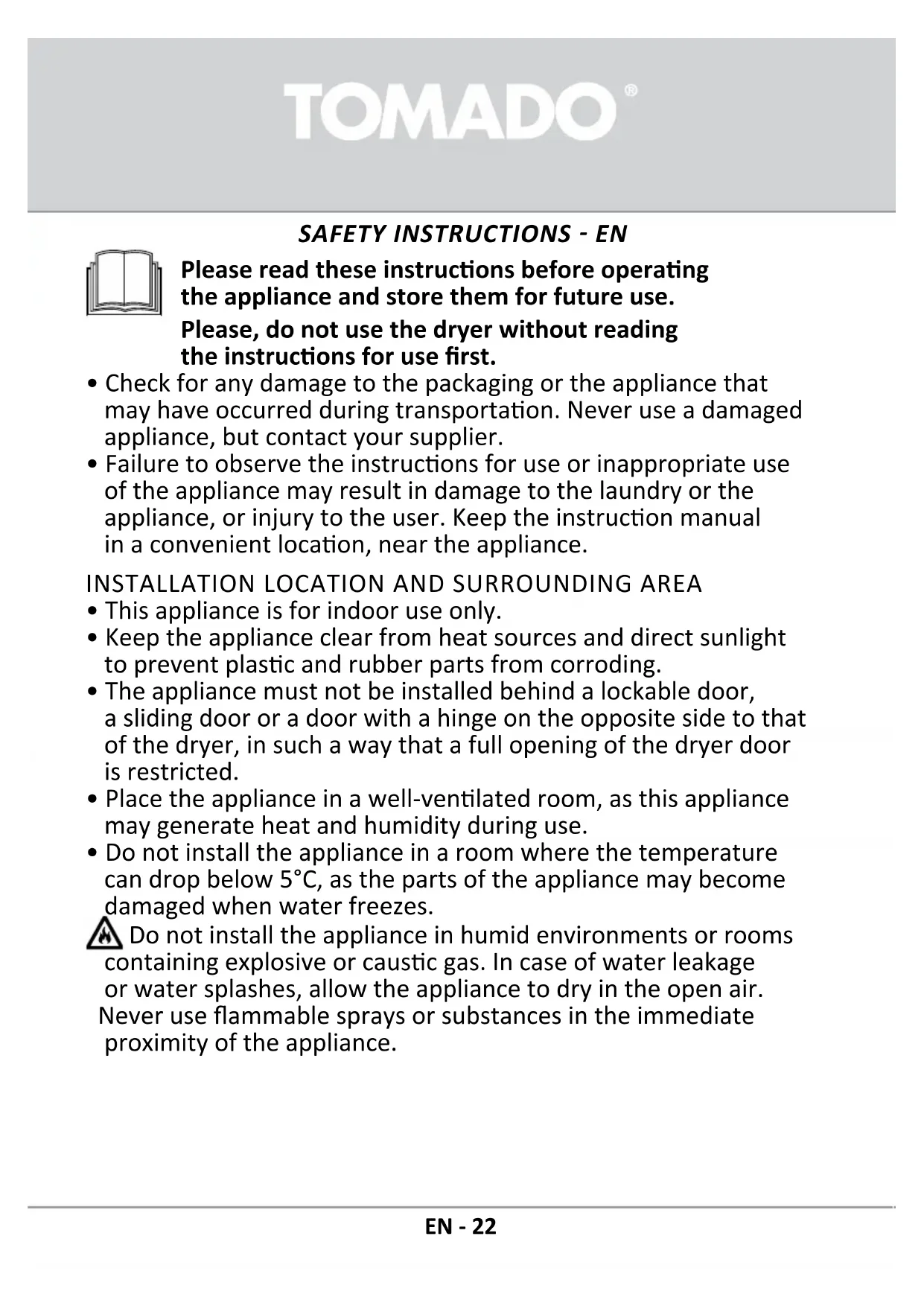 - In case of incorrect appliance connecon, incorrect use, or servicing by an unauthorised person, Tomado will not be responsible for any damage, as such damage will not be covered by warranty.
