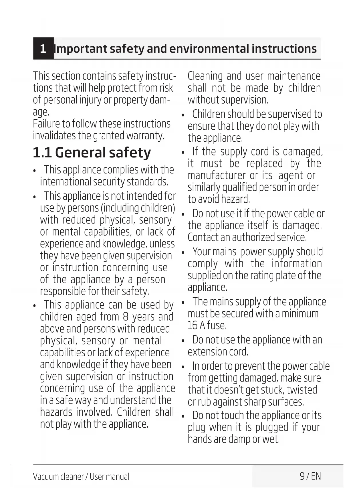 Vacuum cleaner / User manual 9 / EN 1 Important safety and environmental instructions This section contains safety instruc- tions that will help protect from risk of personal injury or property dam- age. Failure to follow these instructions invalidates the granted warranty.