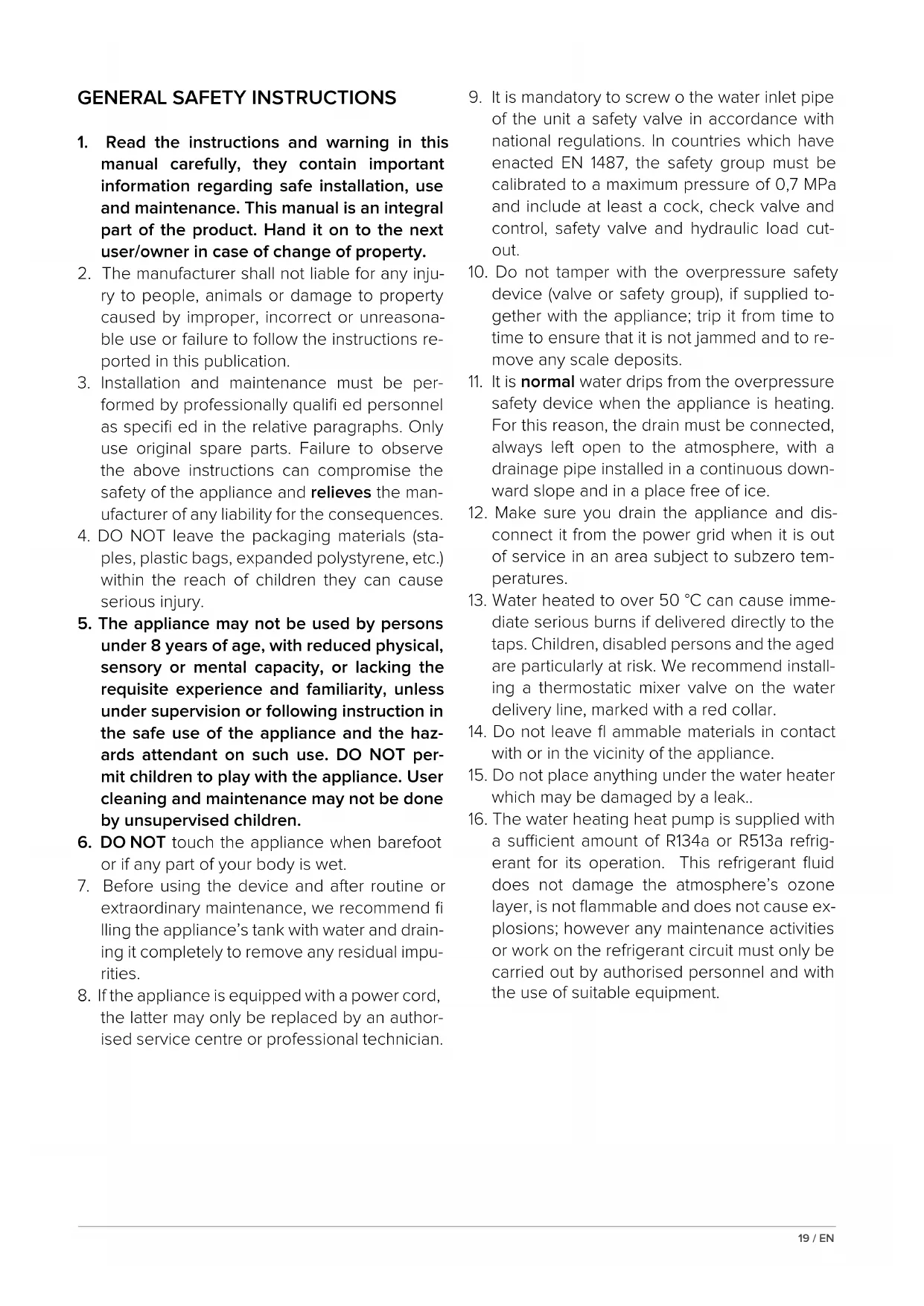 a sucient amount of R134a or R513a refrig- erant for its operation. This refrigerant fluid does not damage the atmosphere’s ozone layer, is not flammable and does not cause ex- plosions; however any maintenance activities or work on the refrigerant circuit must only be carried out by authorised personnel and with the use of suitable equipment.20 /EN SAFETY REGULATIONS Key to symbols: Failure to comply with this warning implies the risk of personal injury, in some circumstances even fatal. Failure to comply with this warning may result in serious damage to property, plants or animals. The manufacturer is not liable for damage resulting from improper use of the product or failure to install it as instructed herein. Install the appliance on a solid basement which is not subject to vibration. Noisiness during operation. When drilling holes in the wall for installation purposes, take care not to damage any electrical wiring or existing piping. Electrocution caused by contact with live wires. Damage to existing installations. Flooding caused by water leaking from damaged pipes. Perform all electrical connections using wires which have a suitable section. The connection product must be carried out following the in