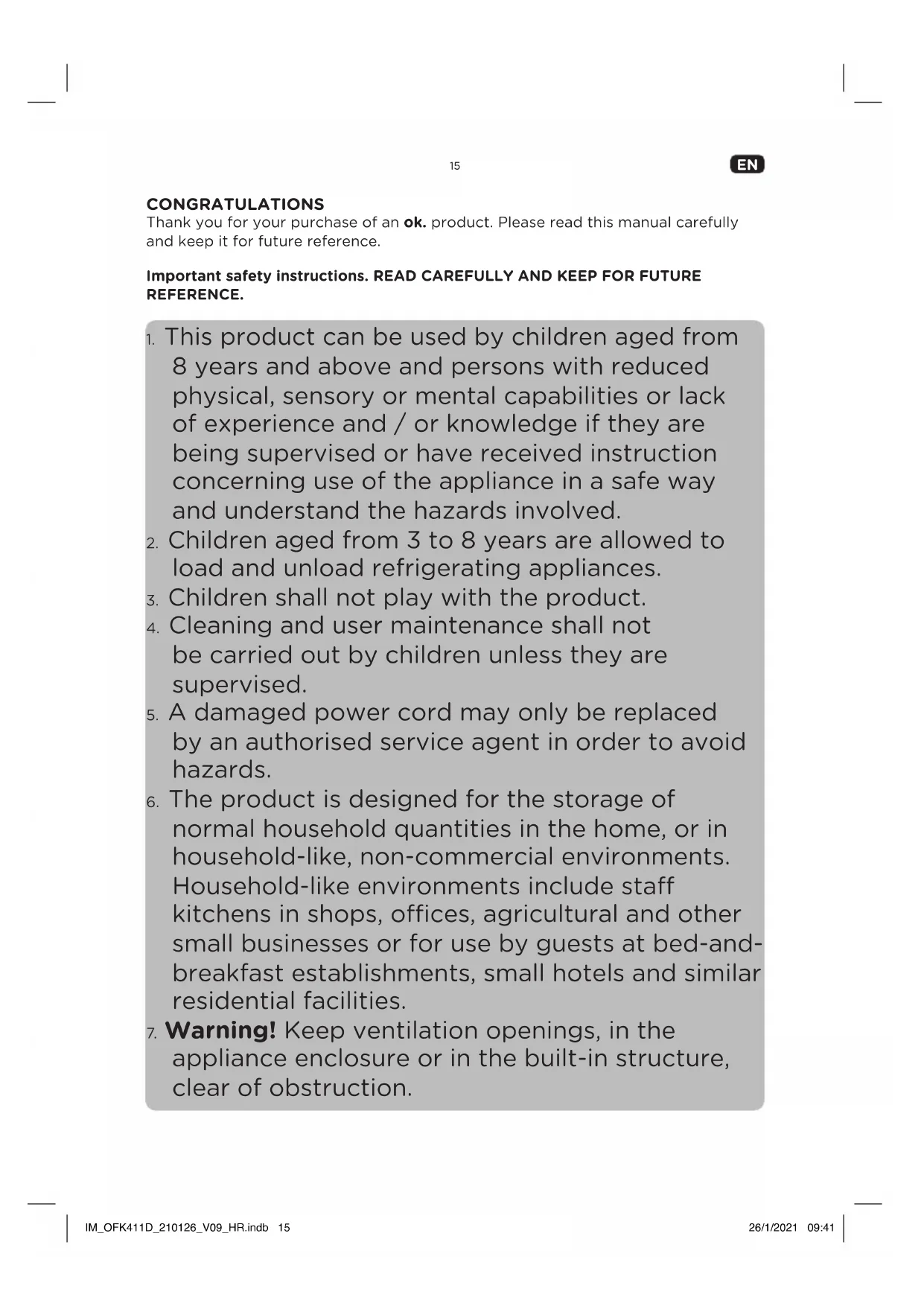 - Vegetables, fruits, poultry, beef: 6-12 months DISPOSAL Do not dispose of this product as unsorted municipal waste. Return it to a designated collection point for the recycling of WEEE. By doing so, you will help to conserve resources and protect the environment. Contact your retailer or local authorities for more information. Refrigerants must be evacuated and disposed of by a qualified specialist in accordance with federal and local regulations before the appliance is scraped. IM_OFK411D_210126_V09_HR.indb 25IM_OFK411D_210126_V09_HR.indb 25 26/1/2021 09:4126/1/2021 09:4126 Size = A5