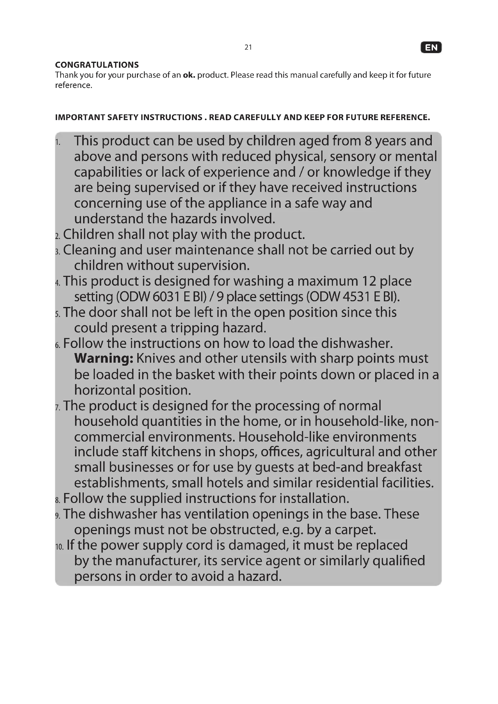 CONGRATULATIONS Thank you for your purchase of an ok. product. Please read this manual carefully and keep it for future reference. IMPORTANT SAFETY INSTRUCTIONS . READ CAREFULLY AND KEEP FOR FUTURE REFERENCE.