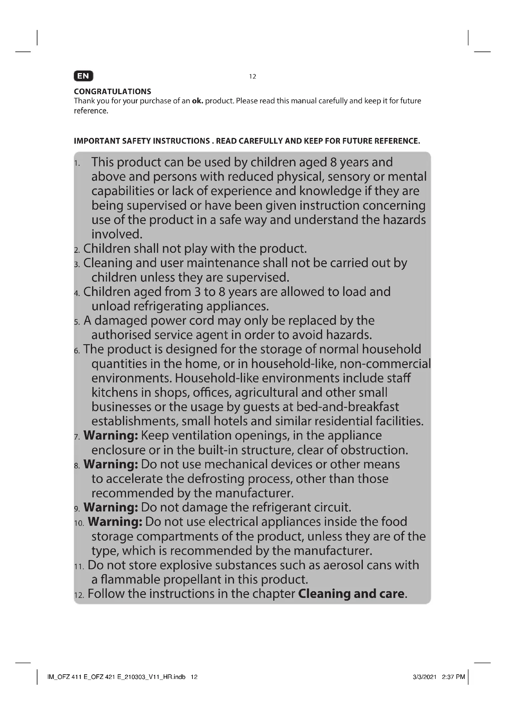 Defrost the freezer when the layer of ice on the surface reaches 3 to 4 mm. Remove all foods from the freezer. Unplug the freezer and open the door. After the ice has molten, wipe up the water and clean the interior. Note: In order to reduce the build-up of ice, make sure, that no items are stored in contact with the walls of the appliance, the door is opened only for a short period of time and never store warm/hot food in the freezer. IM_OFZ 411 E_OFZ 421 E_210303_V11_HR.indb 16IM_OFZ 411 E_OFZ 421 E_210303_V11_HR.indb 16 3/3/2021 2:37 PM3/3/2021 2:37 PM17