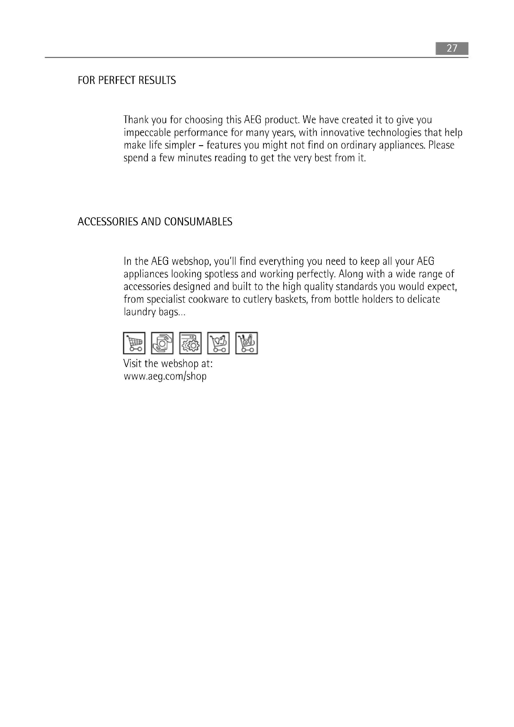 In the AEG webshop, you’ll find everything you need to keep all your AEG appliances looking spotless and working perfectly. Along with a wide range of accessories designed and built to the high quality standards you would expect, from specialist cookware to cutlery baskets, from bottle holders to delicate laundry bags… Visit the webshop at: www.aeg.com/shop 27CONTENTS 29 Safety instructions 32 Product description 33 Control panel 35 Use of the appliance 36 Setting the water softener 37 Use of dishwasher salt 38 Use of detergent and rinse aid 39 Multitab function 40 Loading cutlery and dishes 42 Washing programmes 43 Setting and starting a washing programme 45 Care and cleaning 46 What to do if… 49 Technical data 49 Environment concerns The following symbols are used in this user manual: Important information concerning your personal safety and information on how to avoid damaging the appliance. General information and tips Environmental information Subject to change without notice. 28 ContentsSAFETY INSTRUCTIONS Before the installation and use, read this manual carefully: