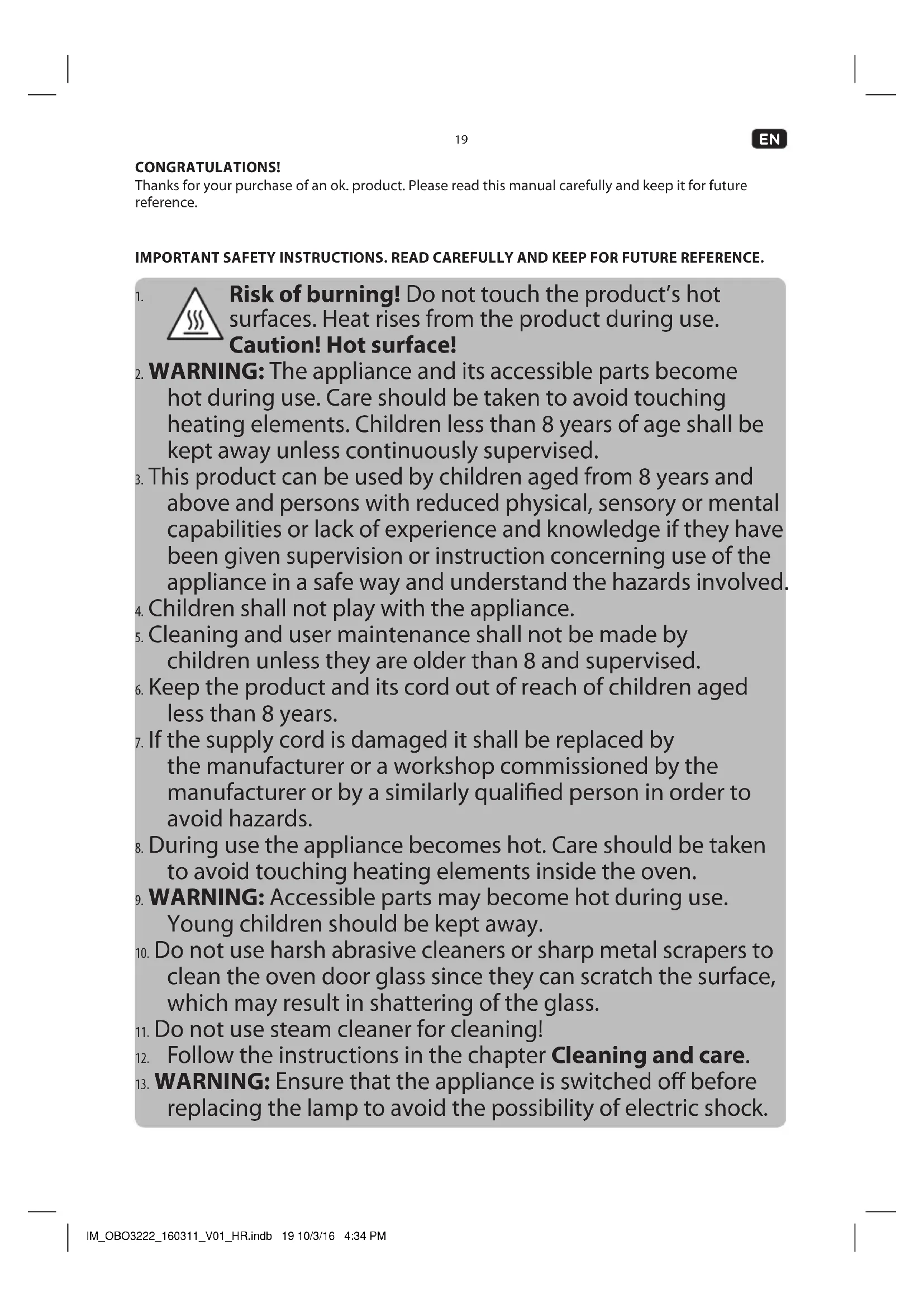 - See website below for detailed technical information or ask your vendor for specication sheet. www.ok-online.com. DISPOSAL The crossed-out wheeled bin logo requires the separate collection of waste electric and electronic equipment (WEEE). Electric and electronic equipment may contain dangerous and hazardous substances. Do not dispose of this appliance as unsorted municipal waste. Return it to a designated collection point for the recycling of WEEE. By doing so, you will help to conserve resources and protect the environment. Contact your retailer or local authorities for more information. IM_OBO3222_160311_V01_HR.indb 26 10/3/16 4:34 PM27