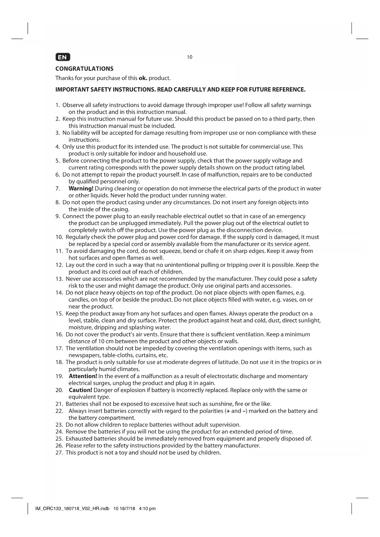 Hereby, [Imtron GmbH] declares that the radio equipment type [ORC 130-B / ORC 133-W / ORC 133-R / ORC 133-BL / ORC 133-PK / ORC 133-GR] is in compliance with Directive 2014/53/EU. The full text of the EU declaration of conformity is available at the following internet address: http://de.ok-online.com/nc/de/suche.html DISPOSAL The crossed-out wheeled bin logo requires the separate collection of waste electric and electronic equipment (WEEE). Electric and electronic equipment may contain dangerous and hazardous substances. Do not dispose of this product as unsorted municipal waste. Return it to a designated collection point for the recycling of WEEE. By doing so, you will help to conserve resources and protect the environment. Contact your retailer or local authorities for more information. Please dispose of batteries in an environmentally friendly manner. Do not put batteries into the household waste. Please use the return and collection systems in your community or contact the dealer where you purchased the product. IM_ORC133_180718_V02_HR.indb 16 18/7/18 4:10 pm17