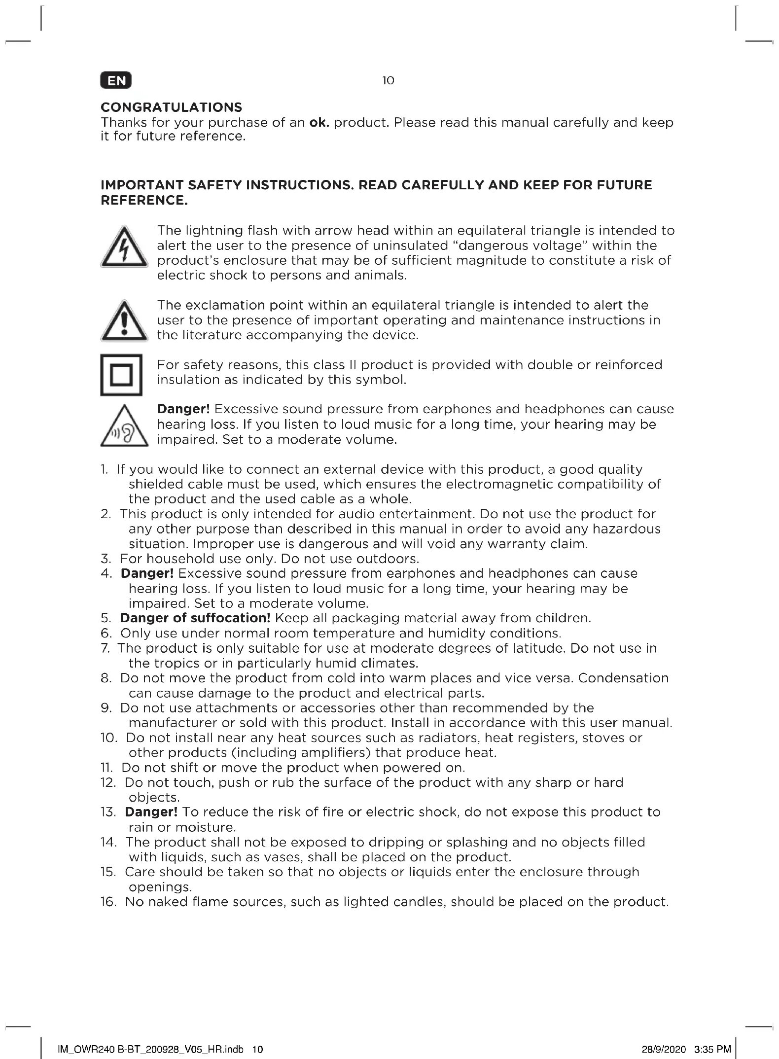 CONGRATULATIONS Thanks for your purchase of an ok. product. Please read this manual carefully and keep it for future reference. IMPORTANT SAFETY INSTRUCTIONS. READ CAREFULLY AND KEEP FOR FUTURE REFERENCE. The lightning flash with arrow head within an equilateral triangle is intended to alert the user to the presence of uninsulated “dangerous voltage” within the product’s enclosure that may be of sucient magnitude to constitute a risk of electric shock to persons and animals. The exclamation point within an equilateral triangle is intended to alert the user to the presence of important operating and maintenance instructions in the literature accompanying the device. For safety reasons, this class II product is provided with double or reinforced insulation as indicated by this symbol. Danger! Excessive sound pressure from earphones and headphones can cause hearing loss. If you listen to loud music for a long time, your hearing may be impaired. Set to a moderate volume.