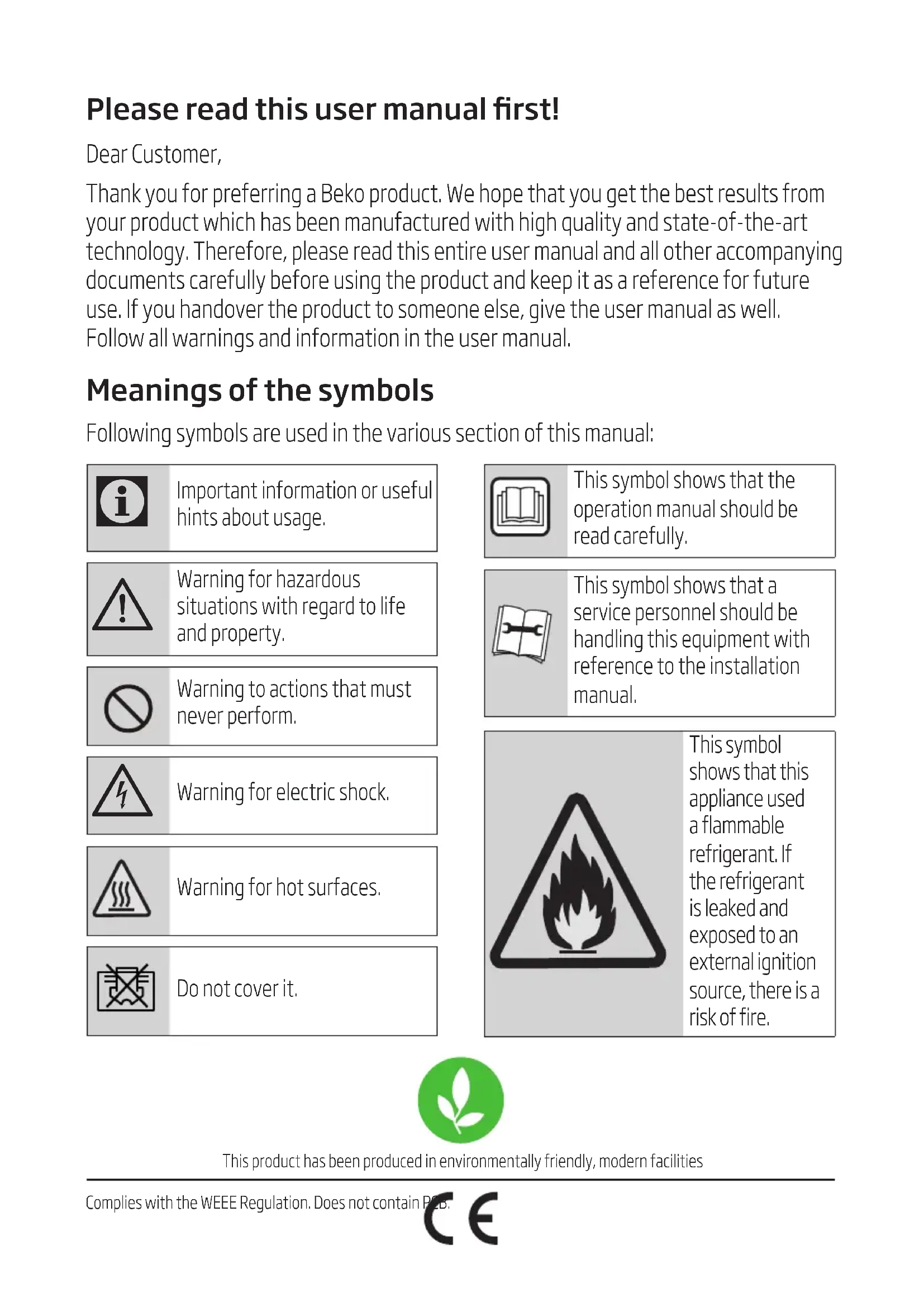CONTENTSPlease read this user manual rst! Dear Customer, Thank you for preferring a Beko product. We hope that you get the best results from your product which has been manufactured with high quality and state-of-the-art technology. Therefore, please read this entire user manual and all other accompanying documents carefully before using the product and keep it as a reference for future use. If you handover the product to someone else, give the user manual as well. Follow all warnings and information in the user manual. Meanings of the symbols Following symbols are used in the various section of this manual: This product has been produced in environmentally friendly, modern facilitiesComplies with the WEEE Regulation. Does not contain PCB.