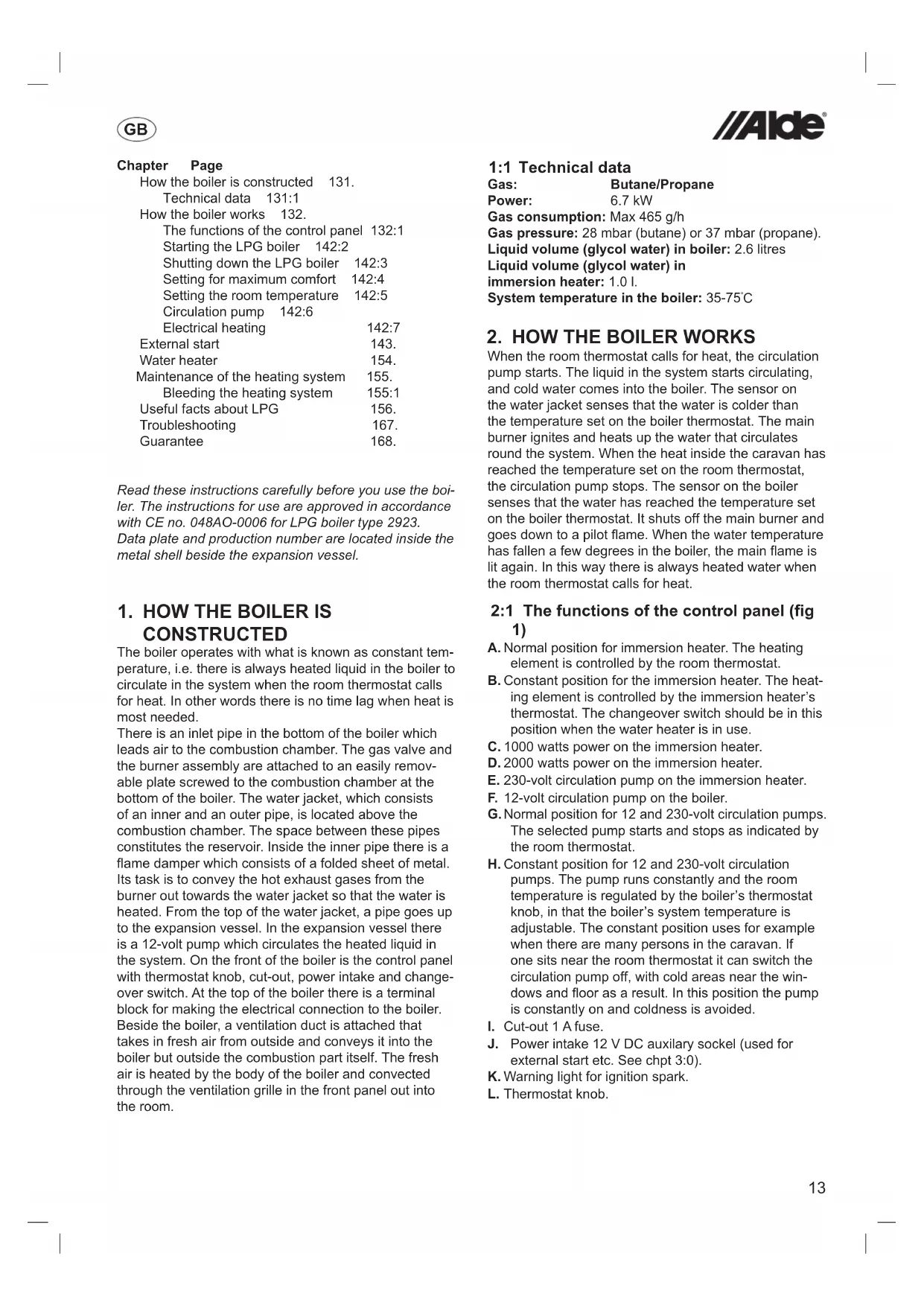 Chapter Page How the boiler is constructed 131. Technical data 131:1 How the boiler works 132. The functions of the control panel 132:1 Starting the LPG boiler 142:2 Shutting down the LPG boiler 142:3 Setting for maximum comfort 142:4 Setting the room temperature 142:5 Circulation pump 142:6 Electrical heating 142:7 External start 143. Water heater 154. Maintenance of the heating system 155. Bleeding the heating system 155:1 Useful facts about LPG 156. Troubleshooting 167. Guarantee 168. Read these instructions carefully before you use the boi- ler. The instructions for use are approved in accordance with CE no. 048AO-0006 for LPG boiler type 2923. Data plate and production number are located inside the metal shell beside the expansion vessel. HOW THE BOILER IS 1. CONSTRUCTED The boiler operates with what is known as constant tem- perature, i.e. there is always heated liquid in the boiler to circulate in the system when the room thermostat calls for heat. In other words there is no time lag when heat is most needed. There is an inlet pipe in the bottom of the boiler which leads air to the combustion chamber. The gas valve and the burner assembly are attached to an easily remov- able plate screwed to the combustion chamber at the bottom of the boiler. The water jacket, which consists of an inner and an outer pipe, is located above the combustion chamber. The space between these pipes constitutes the reservoir. Inside the inner pipe there is a ame damper which consists of a folded sheet of metal. Its task is to convey the hot exhaust gases from the burner out towards the water jacket so that the water is heated. From the top of the water jacket, a pipe goes up to the expansion vessel. In the expansion vessel there is a 12-volt pump which circulates the heated liquid in the system. On the front of the boiler is the control panel with thermostat knob, cut-out, power intake and change- over switch. At the top of the boiler there is a terminal block for making the electrical connection to the boiler. Beside the boiler, a ventilation duct is attached that takes in fresh air from outside and conveys it into the boiler but outside the combustion part itself. The fresh air is heated by the body of the boiler and convected through the ventilation grille in the front panel out into the room. Technical data1:1 Gas: Butane/Propane Power: 6.7 kW Gas consumption: Max 465 g/h Gas pressure: 28 mbar (butane) or 37 mbar (propane). Liquid volume (glycol water) in boiler: 2.6 litres Liquid volume (glycol water) in immersion heater: 1.0 l. System temperature in the boiler: 35-75
