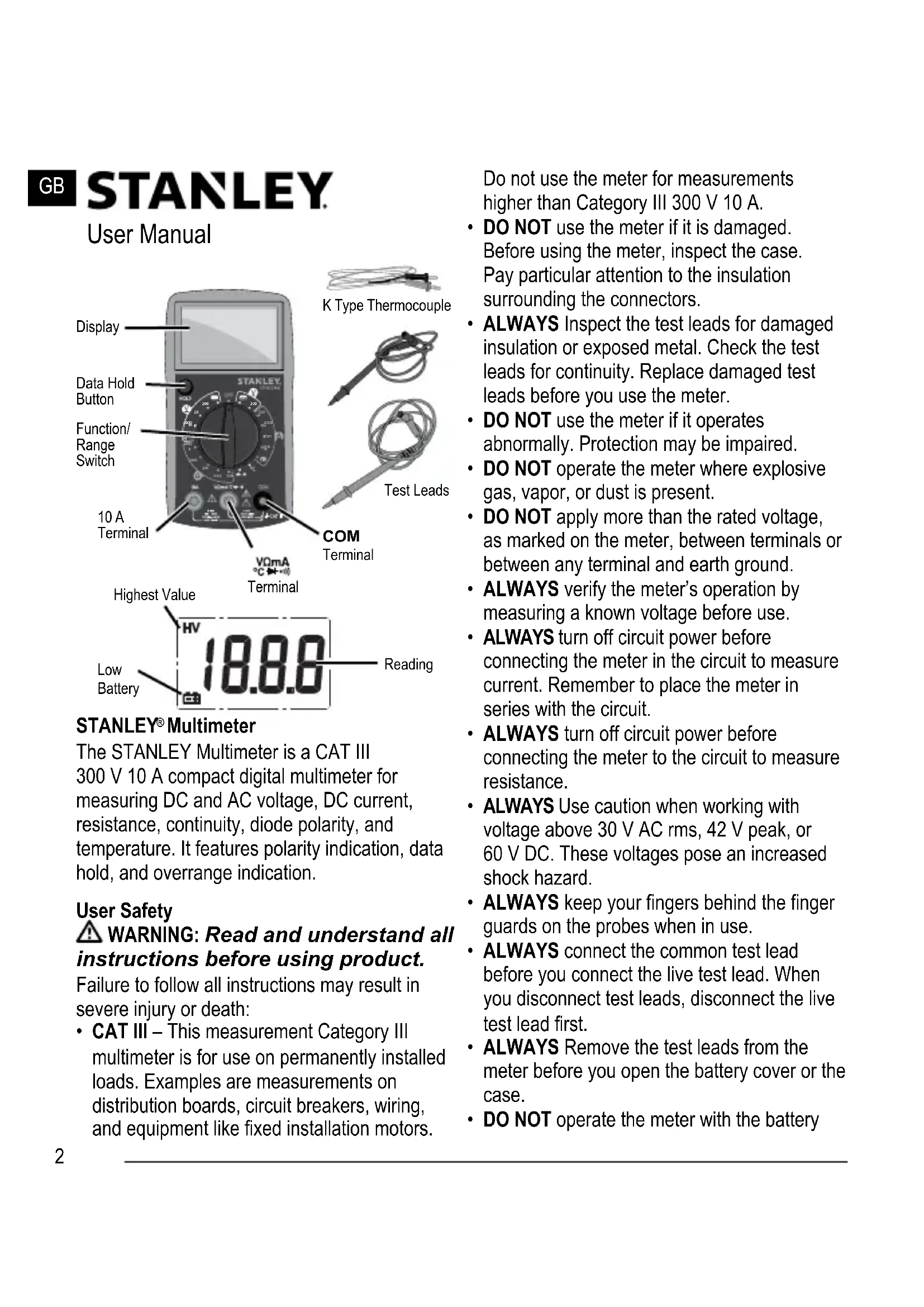 Download the instructions for your Multimeter in PDF format for free! Find your manual STHT077364 - STANLEY and take your electronic device back in hand. On this page are published all the documents necessary for the use of your device. STHT077364 by STANLEY.