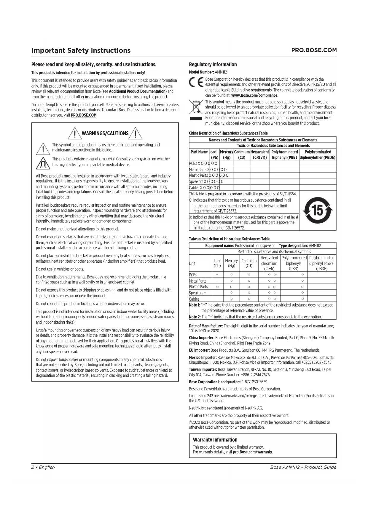 Important Safety Instructions Please read and keep all safety, security, and use instructions. This product is intended for installation by professional installers only! This document is intended to provide users with safety guidelines and basic setup information only. If this product will be mounted or suspended in a permanent, fixed installation, please review all relevant documentation from Bose (see Additional Product Documentation) and from the manufacturer of all other installation components before installing the product. Do not attempt to service this product yourself. Refer all servicing to authorized service centers, installers, technicians, dealers or distributors. To contact Bose Professional or to find a dealer or distributor near you, visit PRO.BOSE.COM. Regulatory Information Model Number: AMM112 Bose Corporation hereby declares that this product is in compliance with the essential requirements and other relevant provisions of Directive 2014/35/EU and all other applicable EU directive requirements. The complete declaration of conformity can be found at: www.Bose.com/compliance. This symbol means the product must not be discarded as household waste, and should be delivered to an appropriate collection facility for recycling. Proper disposal and recycling helps protect natural resources, human health, and the environment. For more information on disposal and recycling of this product, contact your local municipality, disposal service, or the shop where you bought this product. China Restriction of Hazardous Substances Table Names and Contents of Toxic or Hazardous Substances or Elements Toxic or Hazardous Substances and Elements Part Name Lead (Pb) Mercury (Hg) Cadmium (Cd) Hexavalent (CR(VI)) Polybrominated Biphenyl (PBB) Polybrominated diphenylether (PBDE) PCBs X O O O O O Metal Parts X O O O O O Plastic Parts O O O O O O Speakers X O O O O O Cables X O O O O O This table is prepared in accordance with the provisions of SJ/T 11364. O: Indicates that this toxic or hazardous substance contained in all of the homogeneous materials for this part is below the limit requirement of GB/T 26572. X: Indicates that this toxic or hazardous substance contained in at least one of the homogeneous materials used for this part is above the limit requirement of GB/T 26572. Taiwan Restriction of Hazardous Substances Table Equipment name: Professional Loudspeaker Type designation: AMM112 Restricted substances and its chemical symbols Unit Lead (Pb) Mercury (Hg) Cadmium (Cd) Hexavalent chromium (Cr+6) Polybrominated biphenyls (PBB) Polybrominated diphenyl ethers (PBDE) PCBs −
