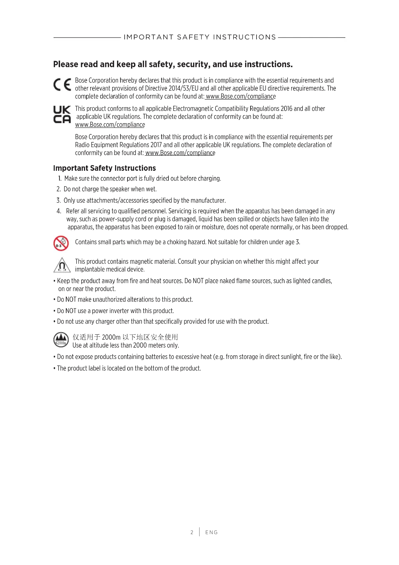 ENG Please read and keep all safety, security, and use instructions. Bose Corporation hereby declares that this product is in compliance with the essential requirements and other relevant provisions of Directive 2014/53/EU and all other applicable EU directive requirements. The complete declaration of conformity can be found at: www.Bose.com/compliance This product conforms to all applicable Electromagnetic Compatibility Regulations 2016 and all other applicable UK regulations. The complete declaration of conformity can be found at: www.Bose.com/compliance Bose Corporation hereby declares that this product is in compliance with the essential requirements per Radio Equipment Regulations 2017 and all other applicable UK regulations. The complete declaration of conformity can be found at: www.Bose.com/compliance Important Safety Instructions