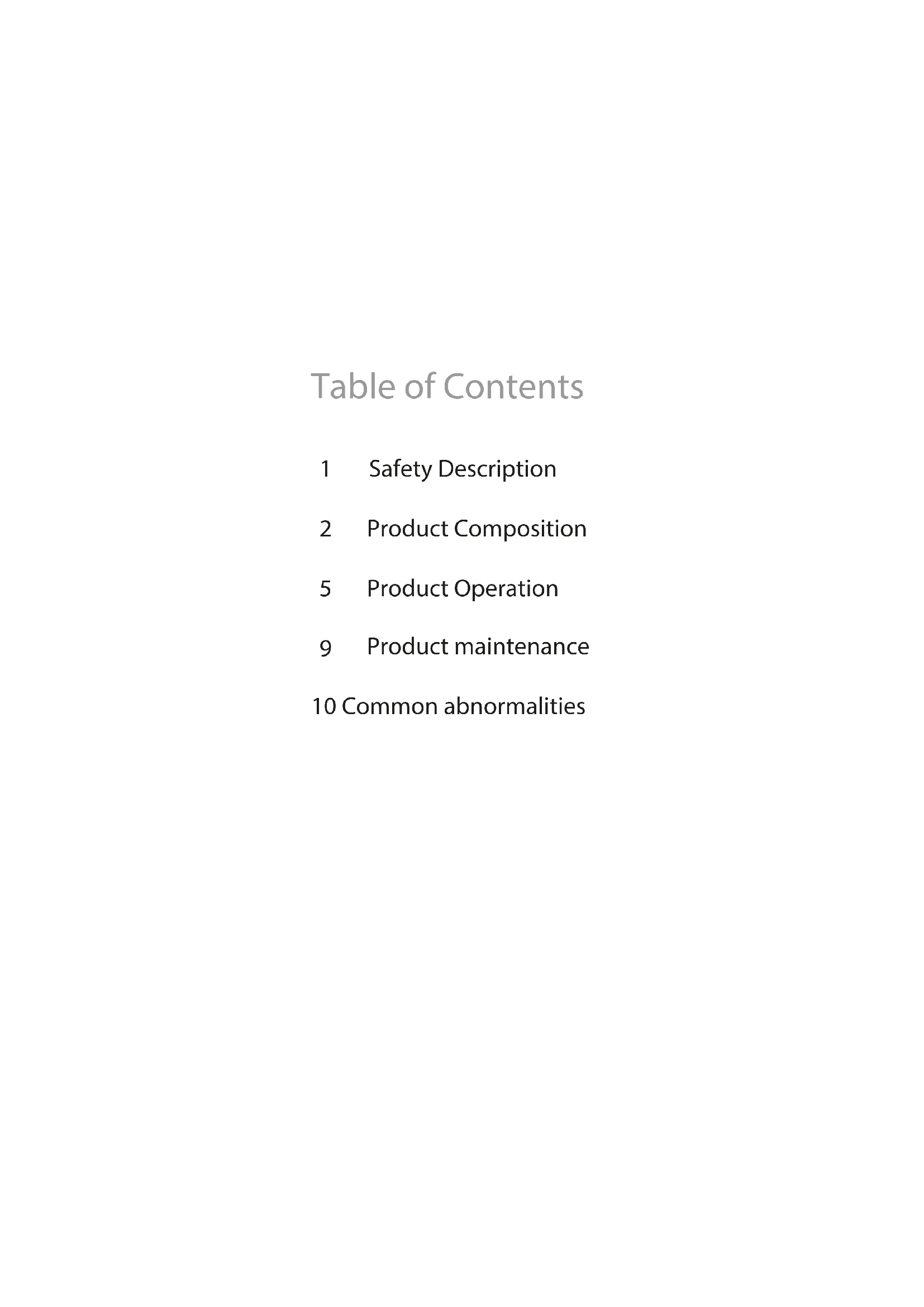 10 Common abnormalitiesSafety Description Please read the following safety descriptions and follow all these safety prevention. measures before using the product. Please read the Manual carefully. Please keep the Manual appropriately. Any operation not conforming to the Manual may cause the product to be damaged. Note: