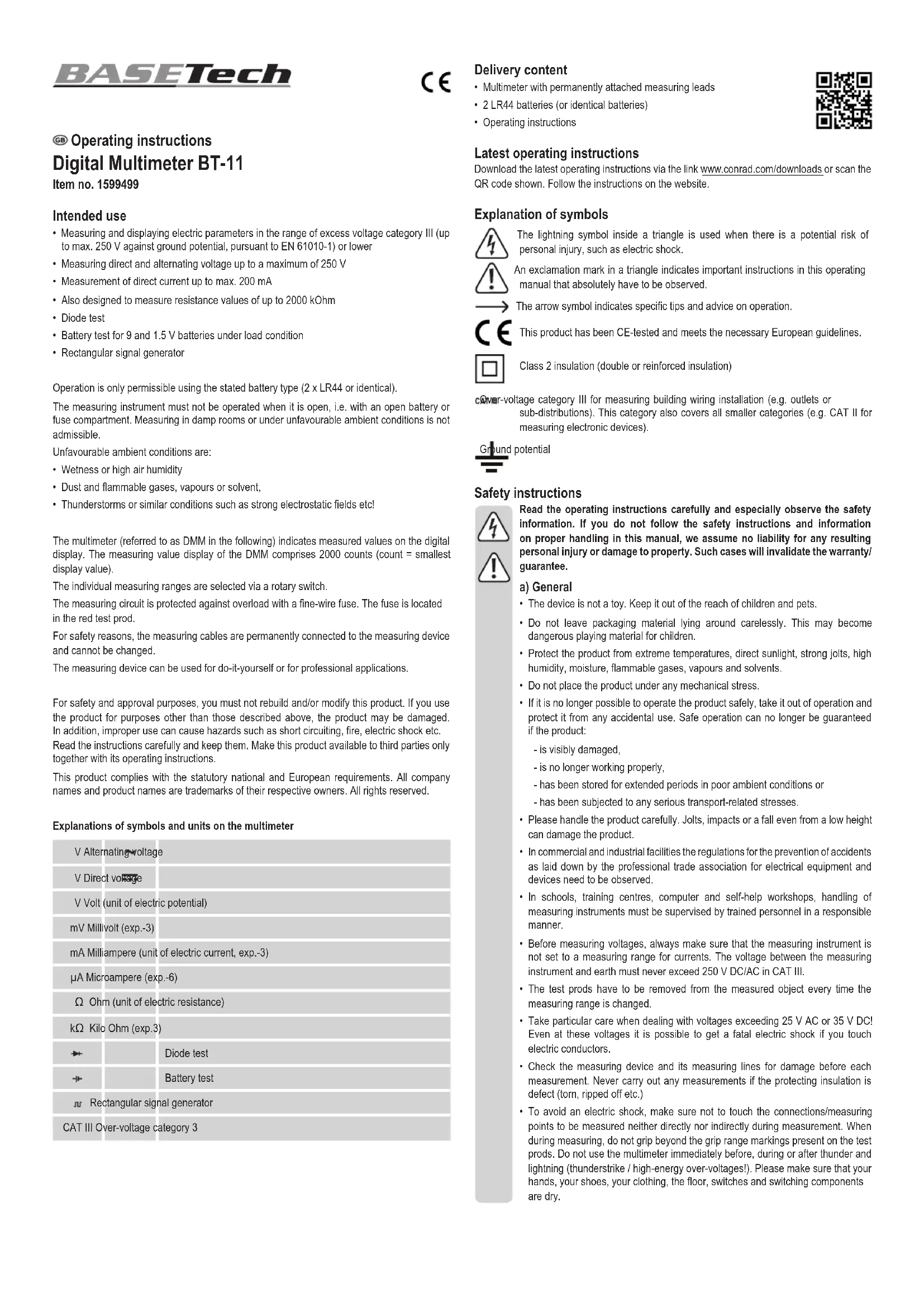 - Operating instructions Latest operating instructions Download the latest operating instructions via the link www.conrad.com/downloads or scan the QR code shown. Follow the instructions on the website. Explanation of symbols The lightning symbol inside a triangle is used when there is a potential risk of personal injury, such as electric shock. An exclamation mark in a triangle indicates important instructions in this operating manual that absolutely have to be observed. Thearrowsymbolindicatesspecictipsandadviceonoperation. This product has been CE-tested and meets the necessary European guidelines. Class 2 insulation (double or reinforced insulation) Over-voltage category III for measuring building wiring installation (e.g. outlets or sub-distributions). This category also covers all smaller categories (e.g. CAT II for measuring electronic devices). Ground potential Safety instructions Read the operating instructions carefully and especially observe the safety information. If you do not follow the safety instructions and information on proper handling in this manual, we assume no liability for any resulting personal injury or damage to property. Such cases will invalidate the warranty/ guarantee. a) General