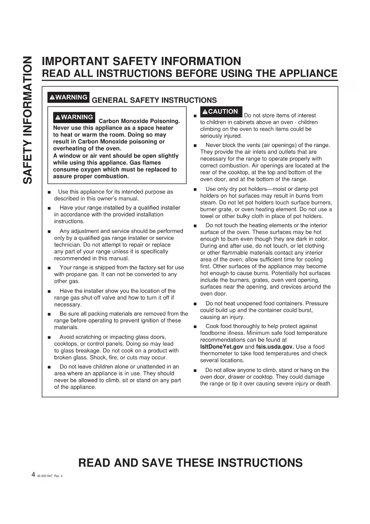 service agency, manufacturer, dealer or the gas supplier. WARNING Read all safety instructions before using the product. Failure to follow these instructions may result in fire, electrical shock, serious injury or death.4 49-2001047 Rev. 4 SAFETY INFORMATION