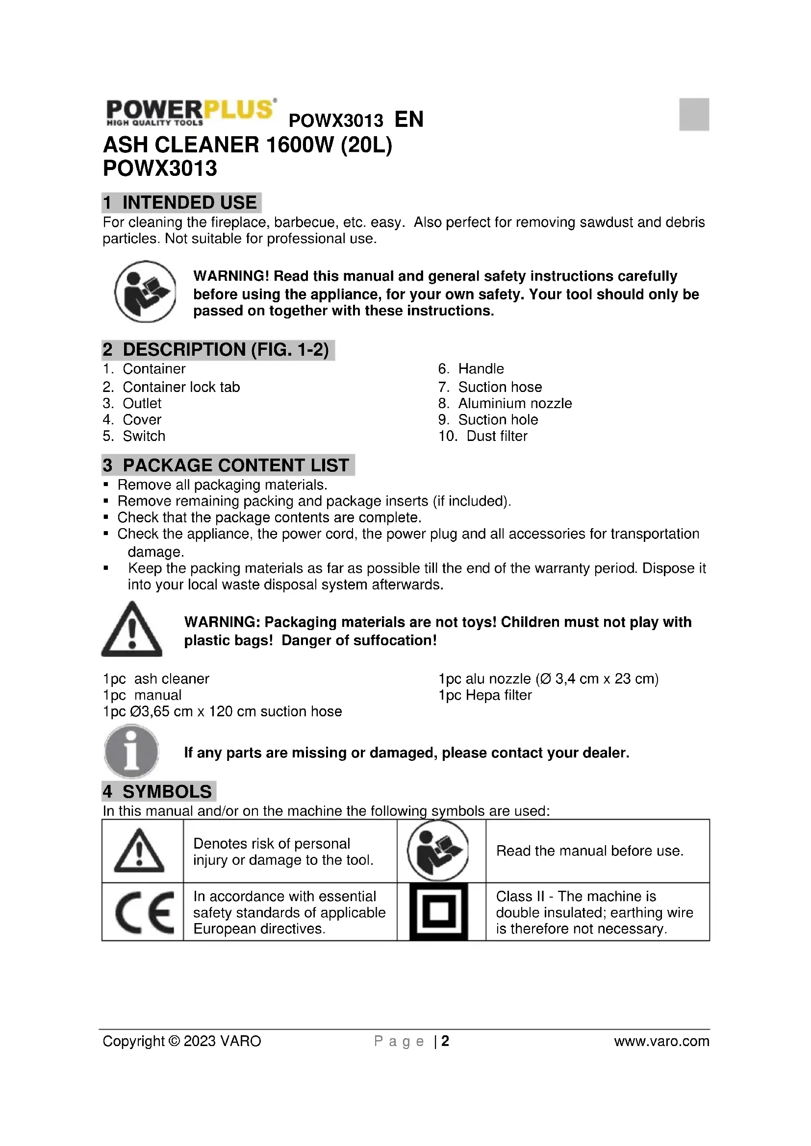 Copyright © 2023 VARO P a g e | 2 www.varo.com ASH CLEANER 1600W (20L) POWX3013 1 INTENDED USE For cleaning the fireplace, barbecue, etc. easy. Also perfect for removing sawdust and debris particles. Not suitable for professional use. WARNING! Read this manual and general safety instructions carefully before using the appliance, for your own safety. Your tool should only be passed on together with these instructions. 2 DESCRIPTION (FIG. 1-2)