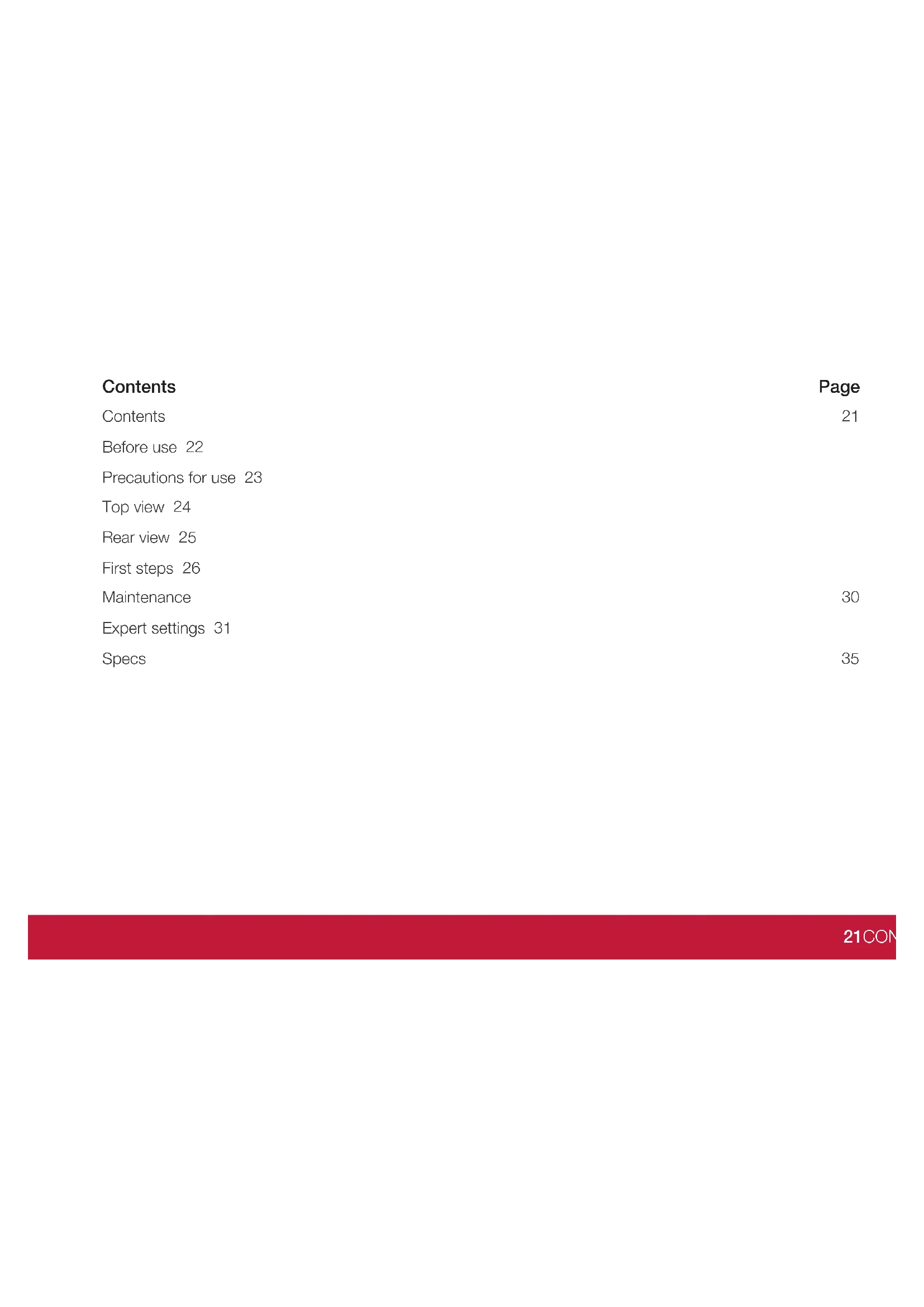 РУКОВОДСТВО ПОЛЬЗОВАТЕЛЯ 使用手册21CONTENTS Contents Page Contents 21 Before use 22 Precautions for use 23 Top view 24 Rear view 25 First steps 26 Maintenance 30 Expert settings 31 Specs 3522 BEFORE USE Before use Thank you for choosing THORENS. Read this manual carefully to get the best performance from this unit.23PRECAUTIONS FOR USE Precautions for use Do not place anything on the dust cover. Objects on the cover might cause noise due to vibrations or fall o, especially during playing. Do not place the unit on an amplifier or any other device that generates heat. Doing so could cause discolora- tion, deformation or malfunction. Also avoid locations that are subject to vibrations or exposed to excessive dust, cold or moisture. As the unit could become warm during operation, always leave sucient space around it for ventilation. When installing this unit, leave a little space between it and other devices and walls to allow good heat dissipation. Do not move the unit during playing, the record rotates. Do not lift or move the unit during playing. Doing so may damage the record, the stylus, the cartridge or the unit. Always remove the record before relocating or moving this unit. Moving the unit with a record on the platter could damage the record, the stylus and the cartridge or could cause a malfunction. The voltage supplied to the unit should match the voltage as printed on the rear panel. If you are in any doubt regarding this matter, consult an electrician. Maintenance Wipe o any dirt on the cabinet and dust cover surfaces using a soft cloth that has been slightly dampened with a diluted neutral cleanser.24 TOP VIEW TOP VIEW