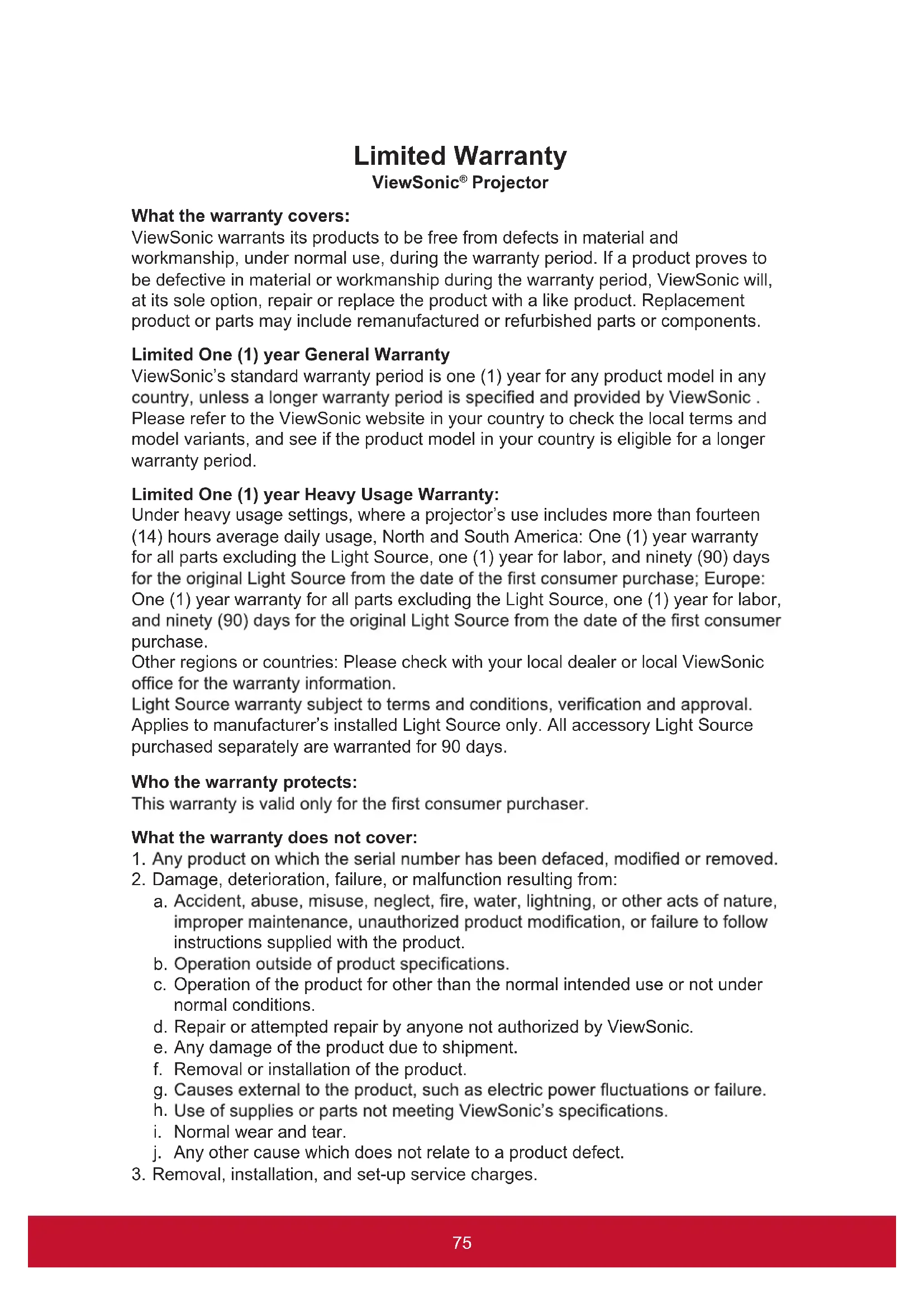 Projector What the warranty covers: ViewSonic warrants its products to be free from defects in material and workmanship, under normal use, during the warranty period. If a product proves to be defective in material or workmanship during the warranty period, ViewSonic will, at its sole option, repair or replace the product with a like product. Replacement product or parts may include remanufactured or refurbished parts or components. Limited One (1) year General Warranty ViewSonic’s standard warranty period is one (1) year for any product model in any Please refer to the ViewSonic website in your country to check the local terms and model variants, and see if the product model in your country is eligible for a longer warranty period. Limited One (1) year Heavy Usage Warranty: Under heavy usage settings, where a projector’s use includes more than fourteen (14) hours average daily usage, North and South America: One (1) year warranty for all parts excluding the Light Source, one (1) year for labor, and ninety (90) days One (1) year warranty for all parts excluding the Light Source, one (1) year for labor, purchase. Other regions or countries: Please check with your local dealer or local ViewSonic Applies to manufacturer’s installed Light Source only. All accessory Light Source purchased separately are warranted for 90 days. Who the warranty protects: What the warranty does not cover: