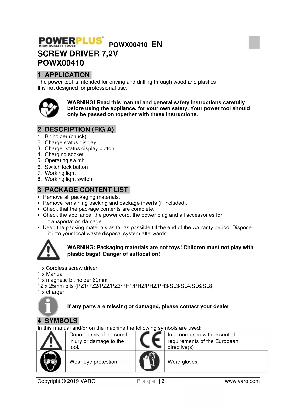 VARO N.V. - Joseph Van Instraat 9 - BE2500 Lier - BELGIUM, declares that, Product: Screw driver 7,2V Trade mark: POWERplus Model: POWX00410 is in conformity with the essential requirements and other relevant provisions of the applicable European Directives, based on the application of European harmonized standards. Any unauthorized modification of the apparatus voids this declaration. European Directives (including, if applicable, their amendments up to the date of signature); 2011/65/EU 2014/30/EU 2006/42/EC European harmonized standards (including, if applicable, their amendments up to the date of signature); EN60745-1 : 2009 EN60745-2-2 : 2010 EN55014-1 : 2017 EN55014-2 : 2015 EN61000-3-2 : 2014 EN61000-3-3 : 2013 Keeper of the Technical Documentation : Philippe Vankerkhove, VARO – Vic. Van Rompuy N.V. The undersigned acts on behalf of the company CEO, Hugo Cuypers Regulatory Affairs – Compliance Manager Lier, 28/09/2018POWX00410 DE Copyright © 2019 VARO Seite | 1 www.varo.com 1 EINSATZBEREICH ......................................................................... 2