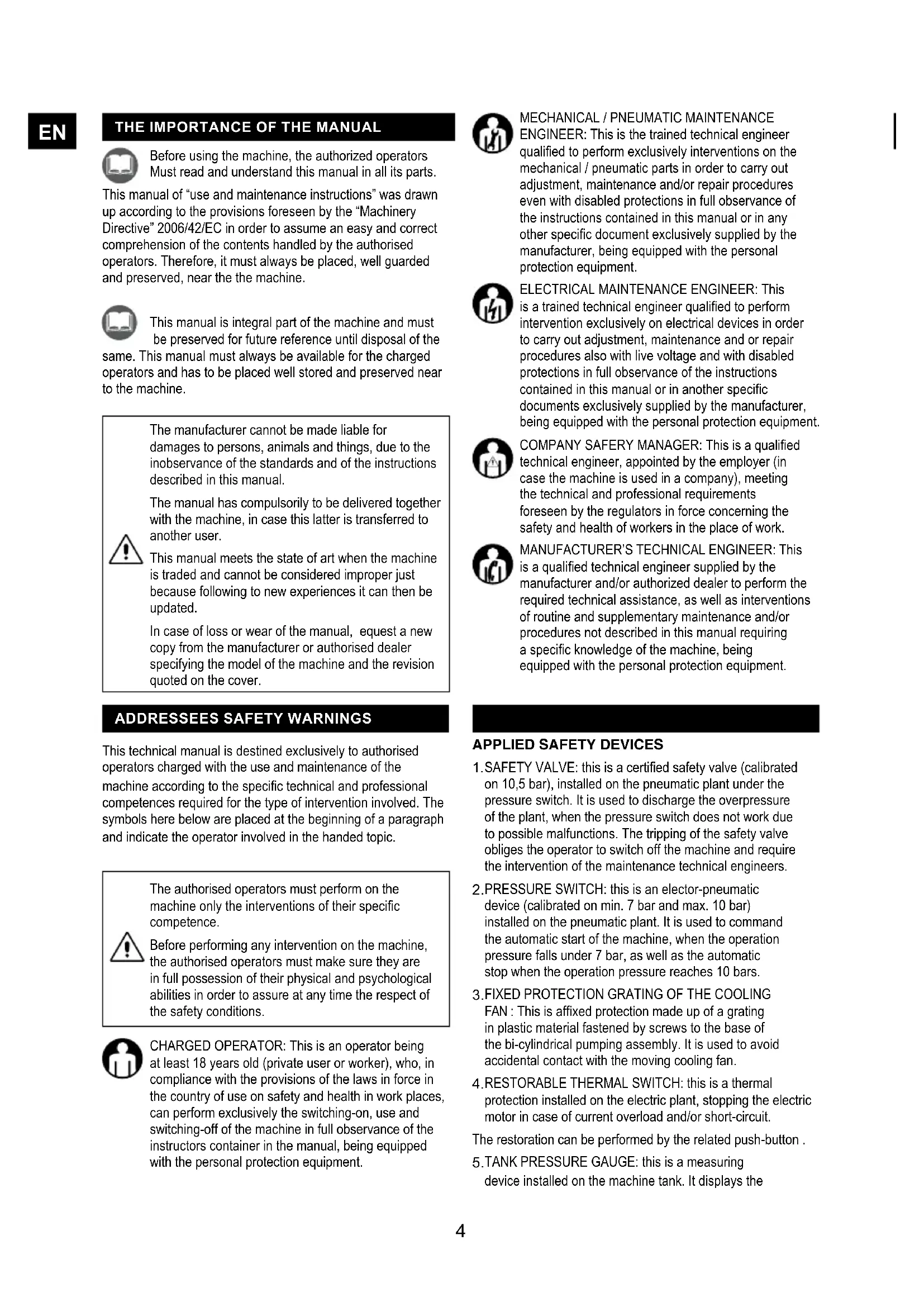 THE REACH OF CHILDREN. FORESEEN USE Air compression (without oil) for the use of suitable pneumatic tools complying with the regulations in force. (ex: guns for blowing, ination, washing, painting or sandblasting; screwers; spot welders, riveters or greasers). OPERATORS CHARGED WITH THE USE An authorized operator meeting the professional requirements described.