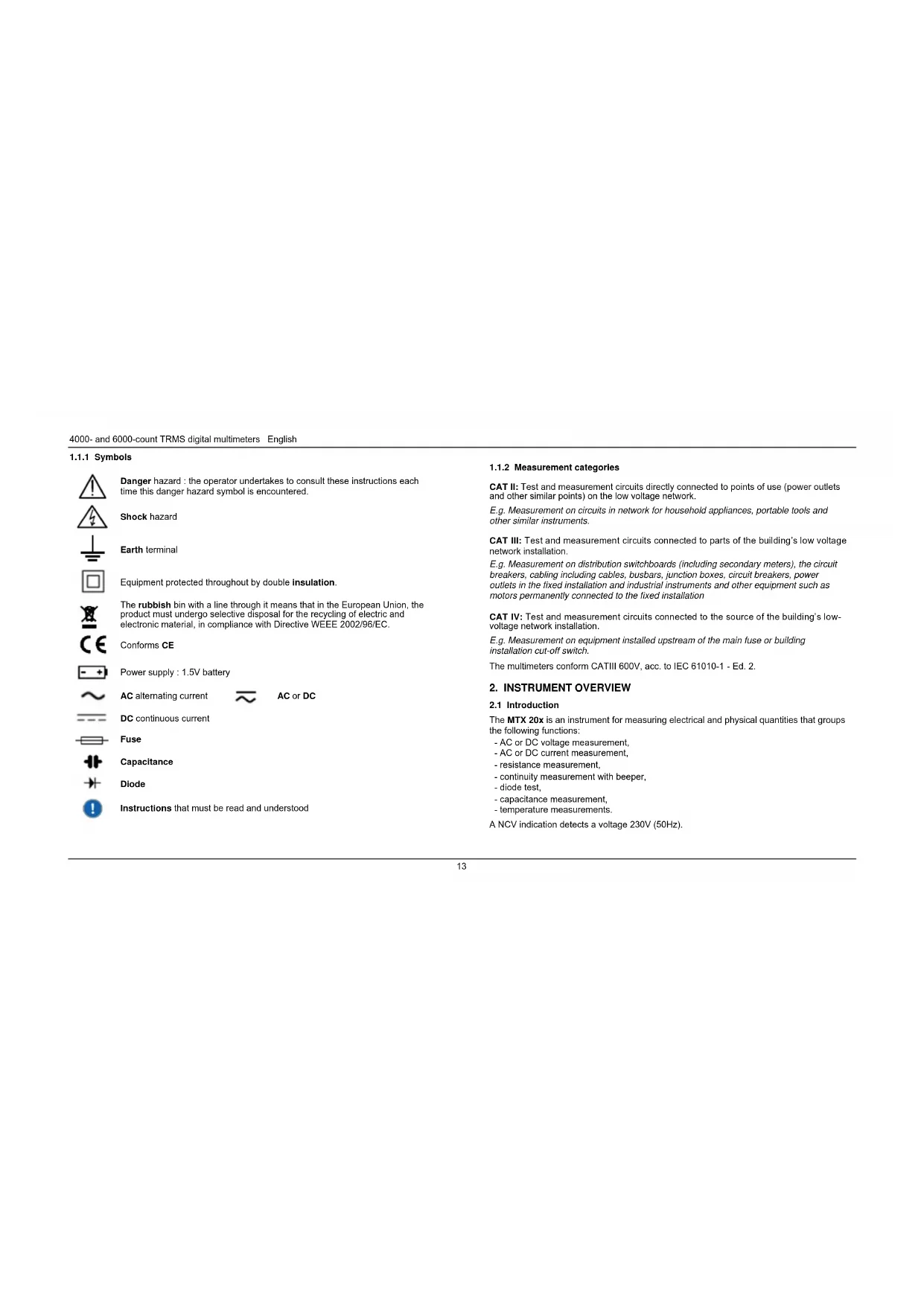 The MTX 20x is an instrument for measuring electrical and physical quantities that groups the following functions: - AC or DC voltage measurement, - AC or DC current measurement, - resistance measurement, - continuity measurement with beeper, - diode test, - capacitance measurement, - temperature measurements. A NCV indication detects a voltage 230V (50Hz).English 4000- and 6000-count TRMS digital multimeters