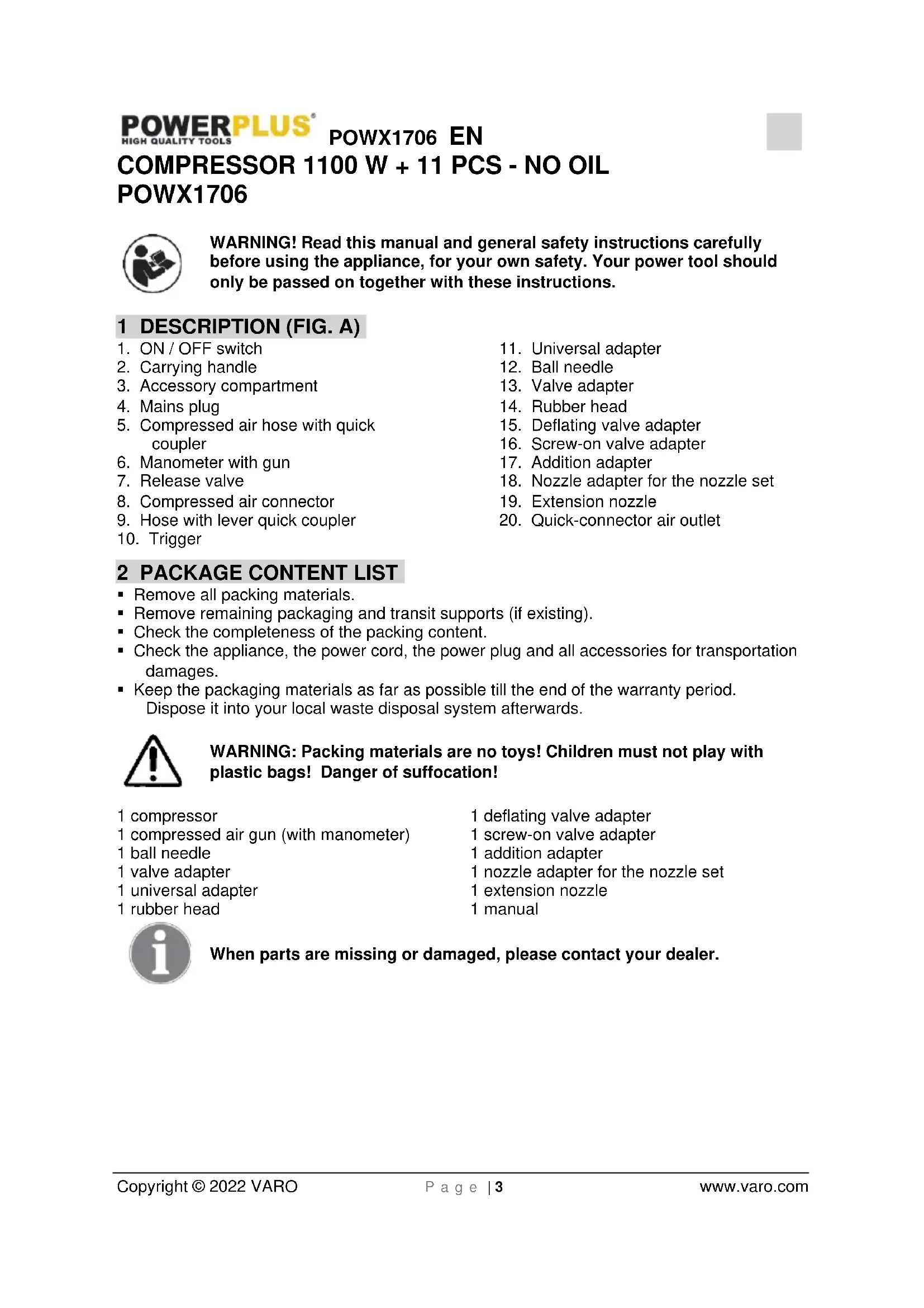 - Keep the work area free. When operating, the compressor must be placed on a stable surface.POWX1706 EN Copyright © 2022 VARO P a g e | 7 www.varo.com