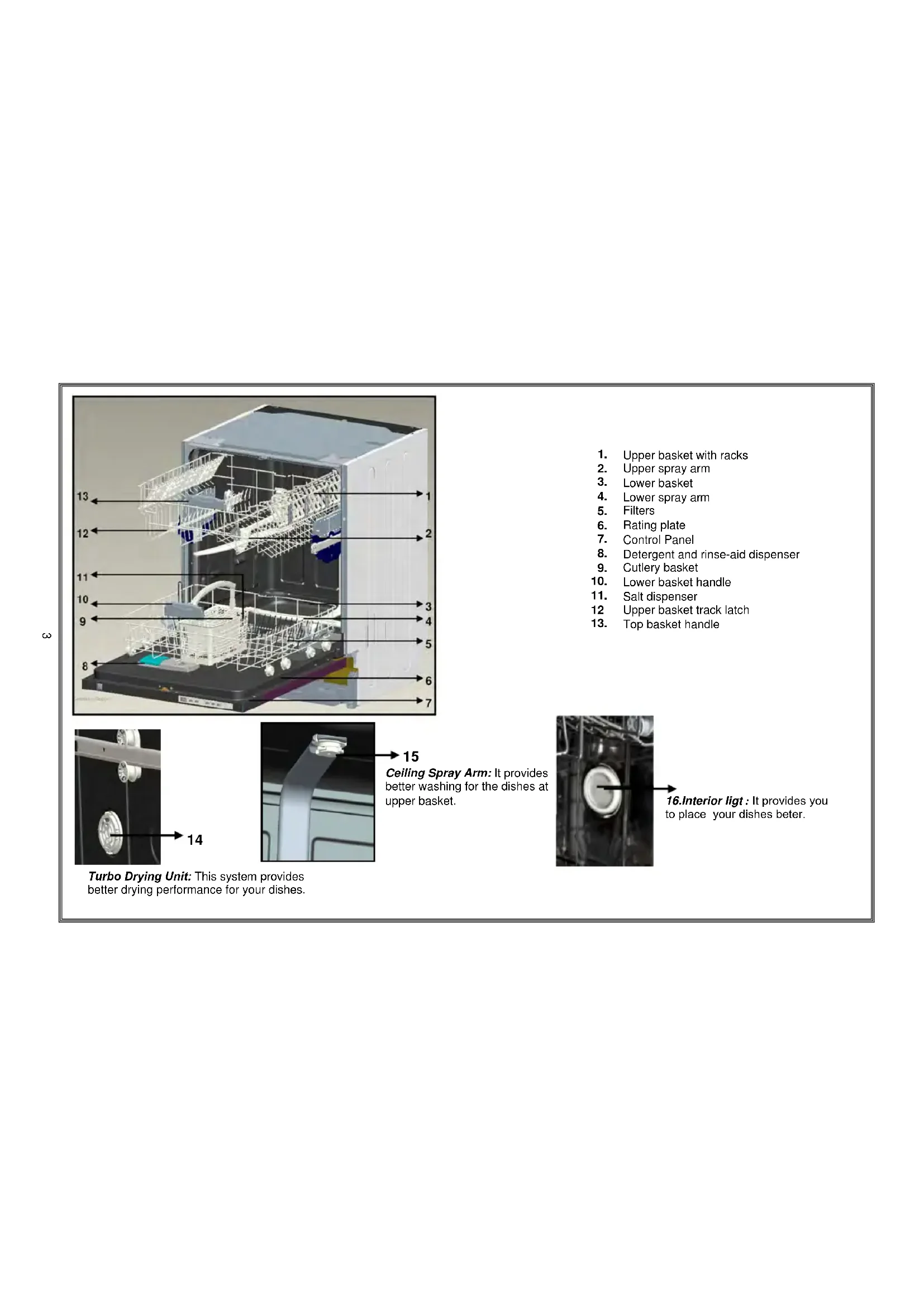 16.Interior ligt : It provides you to place your dishes beter.1.) Power On/Off Button When the Power On/Off button is pressed, end of program indicator starts lighting. 2.) Program Display Program display indicates the times of the programs and the remaining time during the program flow. You can also follow-up the selected programs by this display. 3.) Program selection button With the program selector button, you can select a suitable program for your dishes. 4.) Delay Timer Button You can delay the start time of a selected program for 1-2 ….19 hours by pressing the delay timer button of your machine. When you press the delay timer button, delay “1h” appears on the program display. If you continue pressing the delay timer button, 1-2… 19 will be displayed respectively. You can activate the delayed start by selecting the delay time and the desired washing program with the program selection button. It is also possible to select the program first and the delayed start afterwards. If you want to change or cancel the delayed start time, you can adjust it with the delay timer button; it will be activated according to the last value entered.