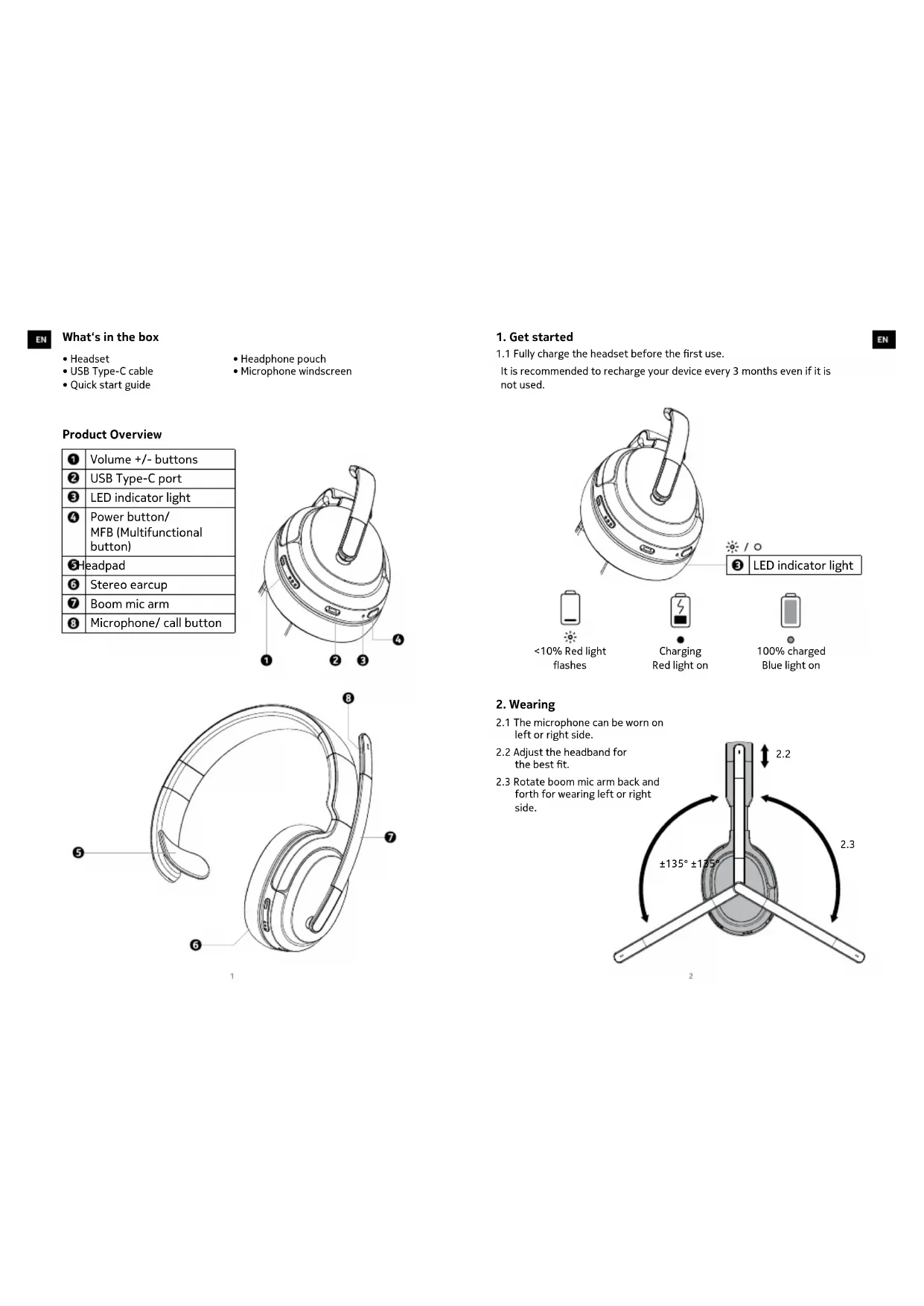 - Microphone windscreen Product Overview Volume +/- buttons USB Type-C port LED indicator light Power button/ MFB (Multifunctional button) v Headpad Stereo earcup Boom mic arm Microphone/ call button LED indicator light <10% Red light ashes Charging Red light on 100% charged Blue light on