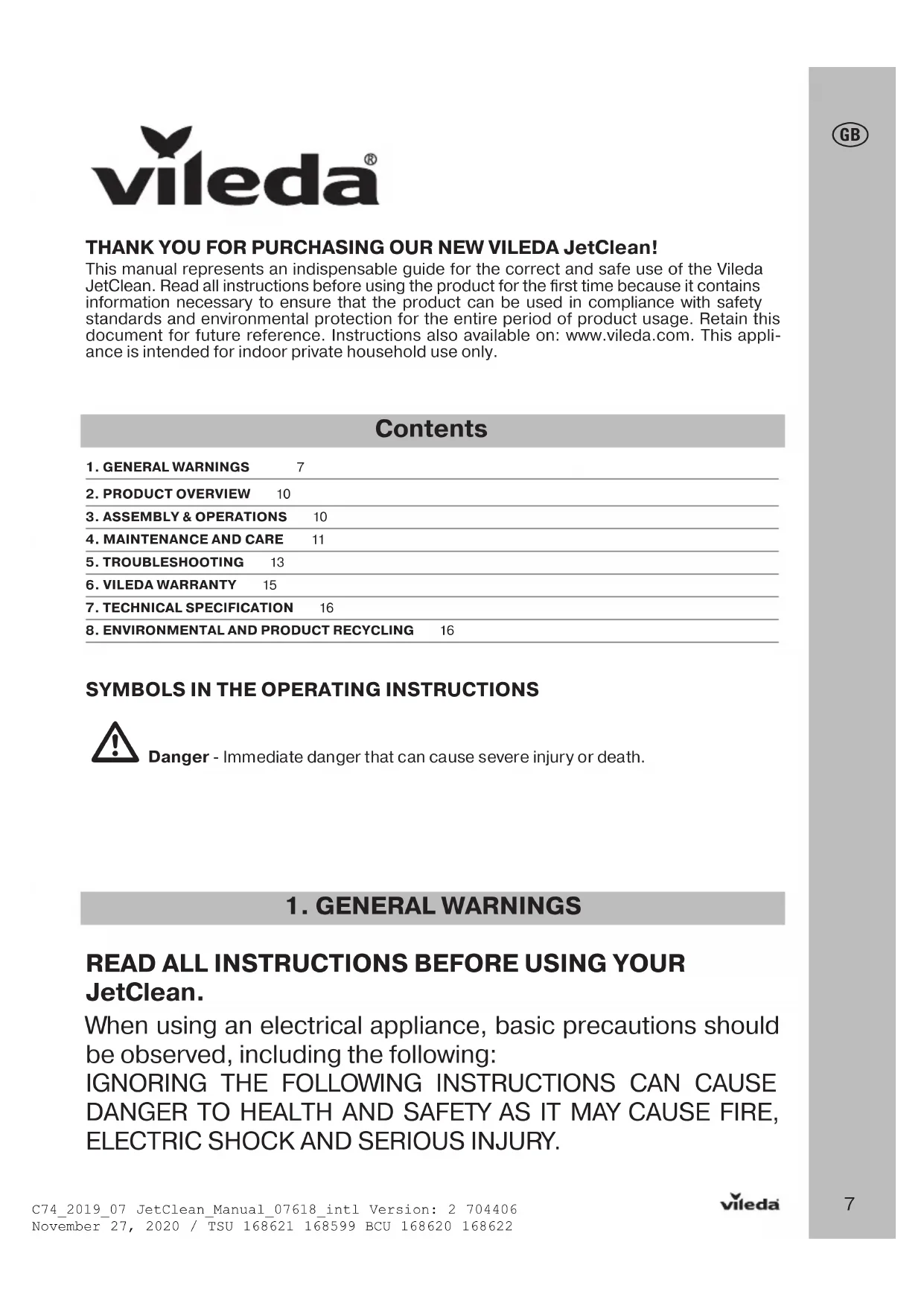 DANGER TO HEALTH AND SAFETY AS IT MAY CAUSE FIRE, ELECTRIC SHOCK AND SERIOUS INJURY. THANK YOU FOR PURCHASING OUR NEW VILEDA JetClean! This manual represents an indispensable guide for the correct and safe use of the Vileda JetClean. Read all instructions before using the product for the first time because it contains information necessary to ensure that the product can be used in compliance with safety standards and environmental protection for the entire period of product usage. Retain this document for future reference. Instructions also available on: www.vileda.com. This appli-ance is intended for indoor private household use only. Contents 1. GENERAL WARNINGS 72. PRODUCT OVERVIEW 103. ASSEMBLY & OPERATIONS 104. MAINTENANCE AND CARE 115. TROUBLESHOOTING 136. VILEDA WARRANTY 157. TECHNICAL SPECIFICATION 168. ENVIRONMENTAL AND PRODUCT RECYCLING 16C74_2019_07 JetClean_Manual_07618_intl Version: 2 704406November 27, 2020 / TSU 168621 168599 BCU 168620 1686228