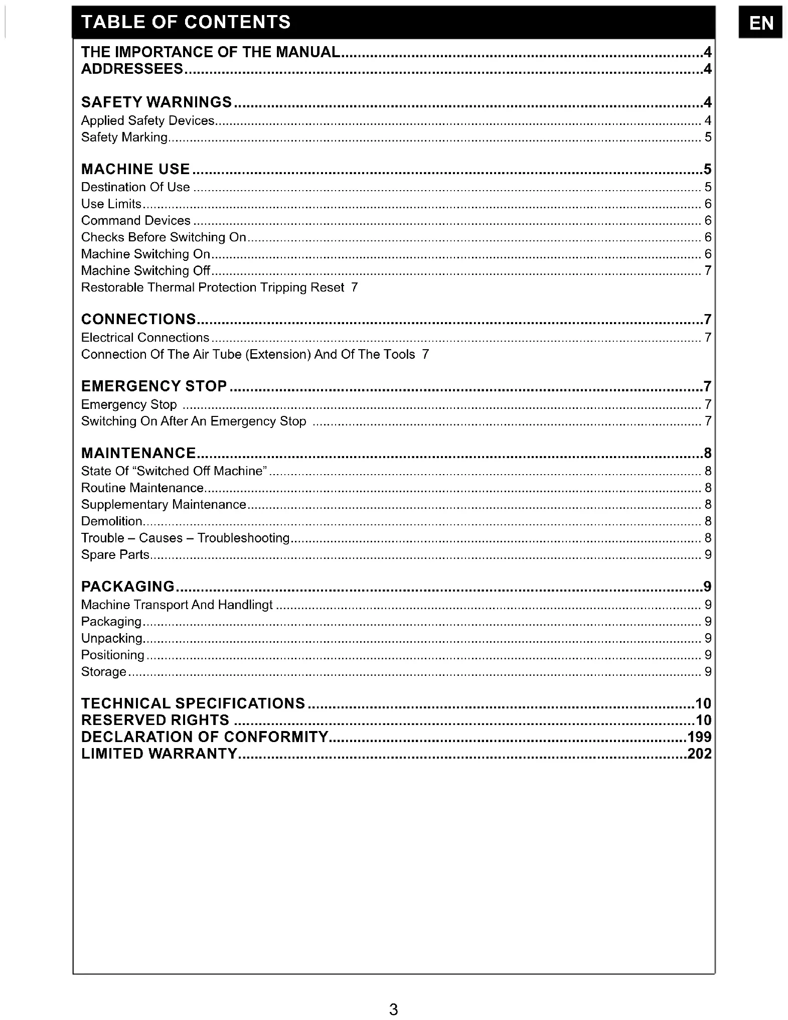 ENGINEER: This is the trained technical engineer qualied to perform exclusively interventions on the mechanical / pneumatic parts in order to carry out adjustment, maintenance and/or repair procedures even with disabled protections in full observance of the instructions contained in this manual or in any other specic document exclusively supplied by the manufacturer, being equipped with the personal protection equipment. ELECTRICAL MAINTENANCE ENGINEER: This is a trained technical engineer qualied to perform intervention exclusively on electrical devices in order to carry out adjustment, maintenance and or repair procedures also with live voltage and with disabled protections in full observance of the instructions contained in this manual or in another specic documents exclusively supplied by the manufacturer, being equipped with the personal protection equipment. COMPANY SAFERY MANAGER: This is a qualied technical engineer, appointed by the employer (in case the machine is used in a company), meeting the technical and professional requirements foreseen by the regulators in force concerning the safety and health of workers in the place of work. MANUFACTURER’S TECHNICAL ENGINEER: This is a qualied technical engineer supplied by the manufacturer and/or authorized dealer to perform the required technical assistance, as well as interventions of routine and supplementary maintenance and/or procedures not described in this manual requiring a specic knowledge of the machine, being equipped with the personal protection equipment. This manual is integral part of the machine and must be preserved for future reference until disposal of the same. This manual must always be available for the charged operators and has to be placed well stored and preserved near to the machine. Before using the machine, the authorized operators Must read and understand this manual in all its parts. This manual of “use and maintenance instructions” was drawn up according to the provisions foreseen by the “Machinery Directive” 2006/42/EC in order to assume an easy and correct comprehension of the contents handled by the authorised operators. Therefore, it must always be placed, well guarded and preserved, near the the machine.