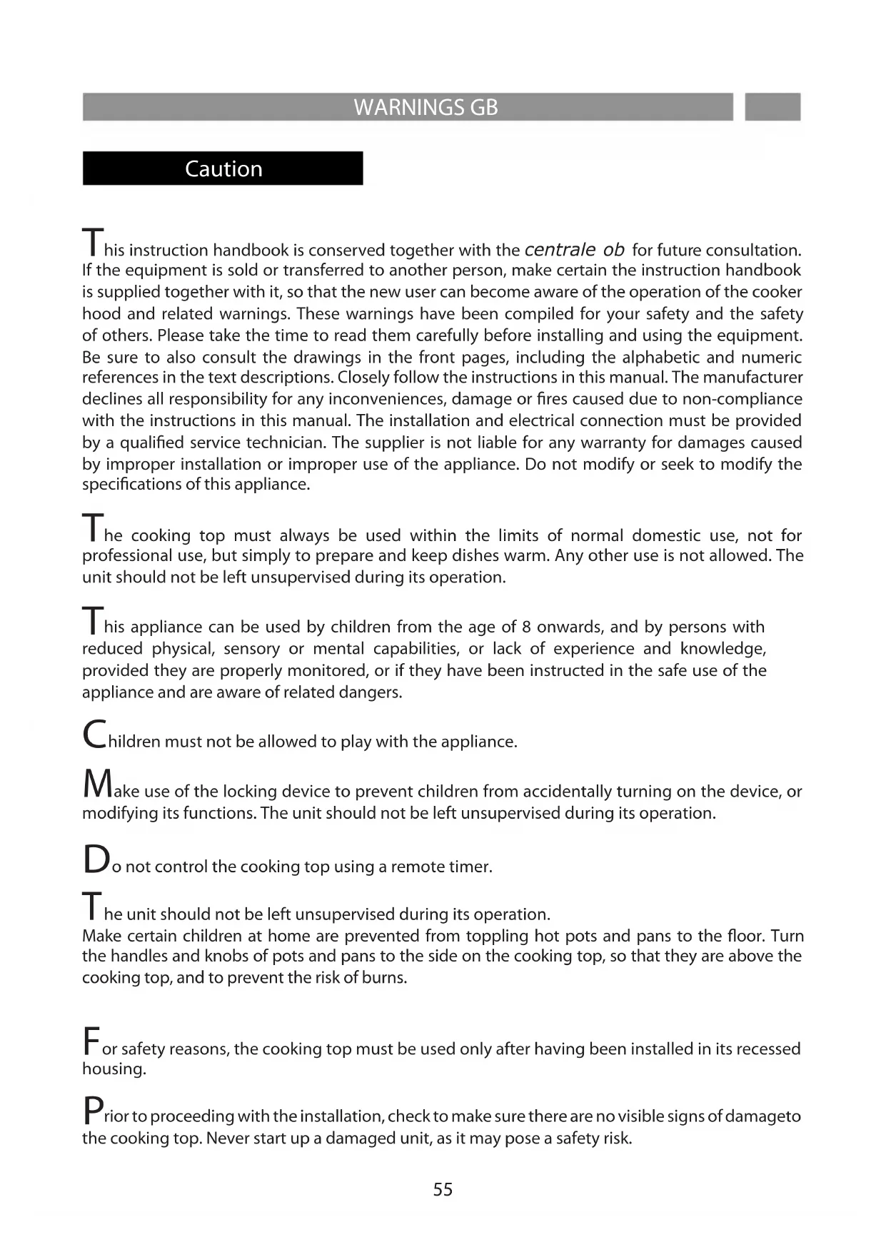 his instruction handbook is conserved together with the centrale ob for future consultation. If the equipment is sold or transferred to another person, make certain the instruction handbook is supplied together with it, so that the new user can become aware of the operation of the cooker hood and related warnings. These warnings have been compiled for your safety and the safety of others. Please take the time to read them carefully before installing and using the equipment. Be sure to also consult the drawings in the front pages, including the alphabetic and numeric references in the text descriptions. Closely follow the instructions in this manual. The manufacturer declines all responsibility for any inconveniences, damage or res caused due to non-compliance with the instructions in this manual. The installation and electrical connection must be provided by a qualied service technician. The supplier is not liable for any warranty for damages caused by improper installation or improper use of the appliance. Do not modify or seek to modify the specications of this appliance.