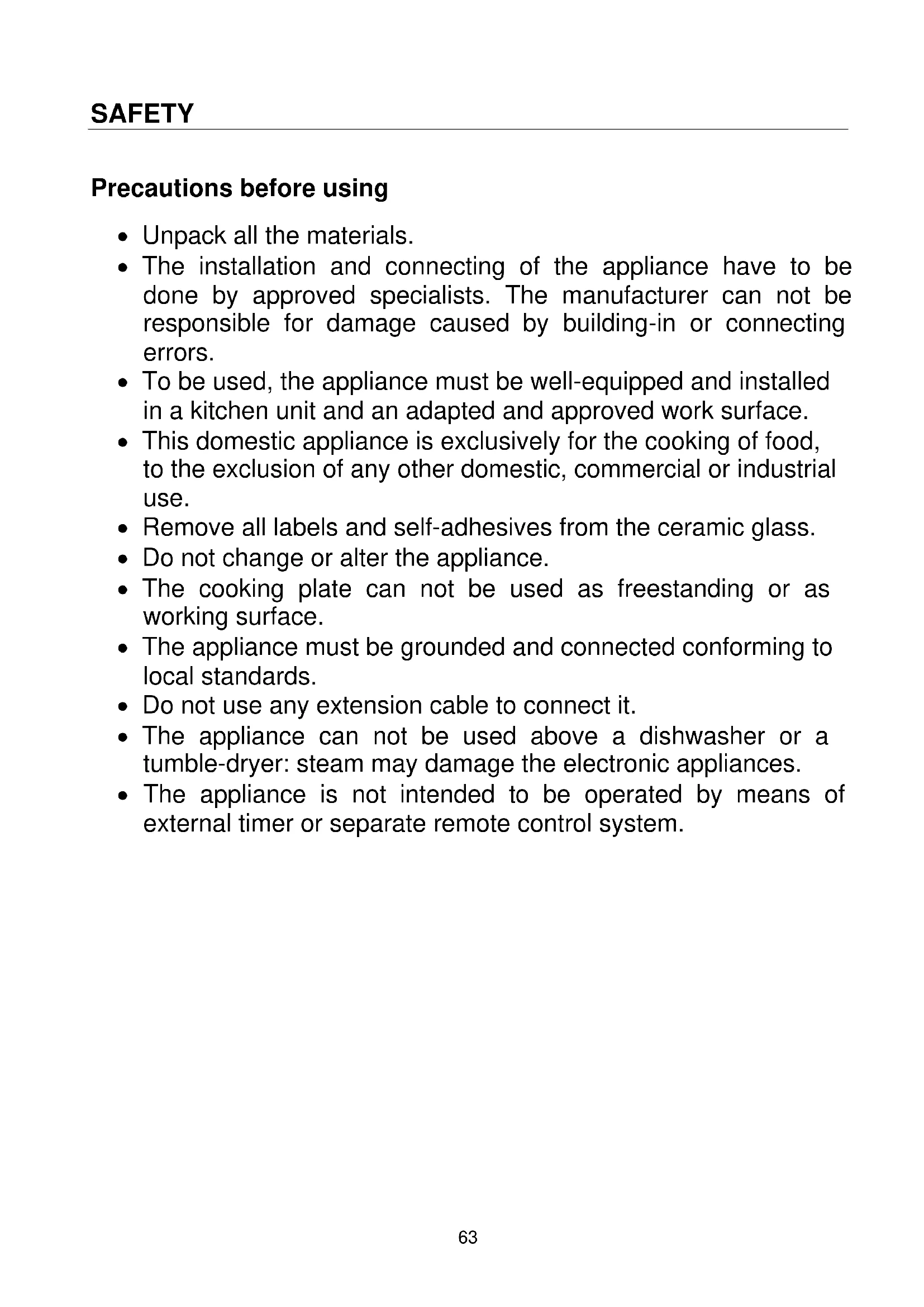 - Sugar, synthetic materials or aluminium sheets must not contact with the heating zones. These may cause breaks or other alterations of the vitroceramic glass by cooling: switch on the appliance and take them immediately out of the hot heating zone (be careful: do not burn yourself).